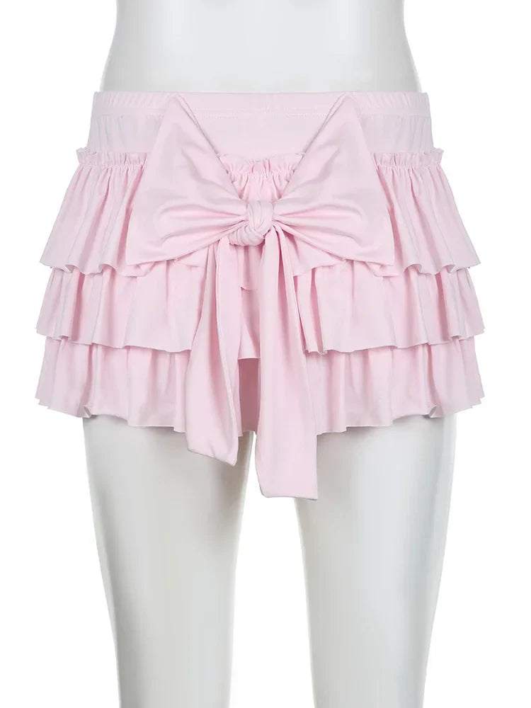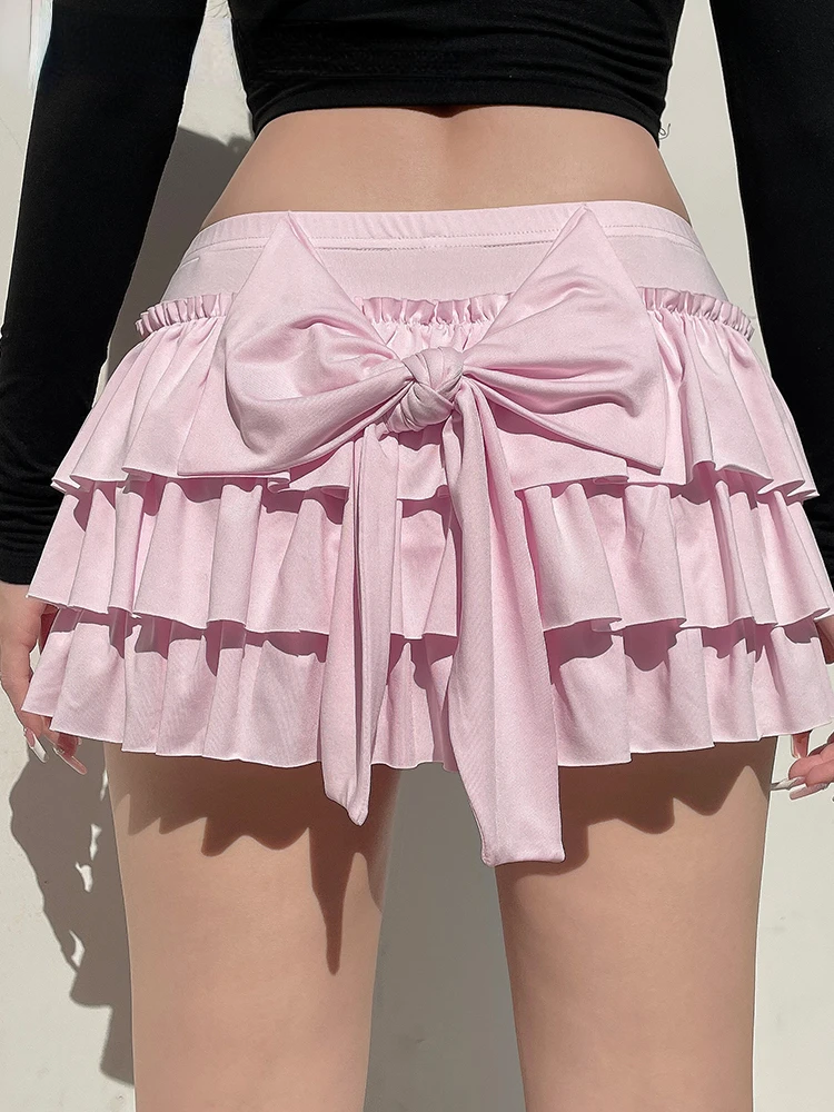 New Pink Casual Sweet Solid Bow A-Line Skirt with Skirt Slim Low-Waisted Mini Skirts Women Fashion Streetwear Ladies Chic