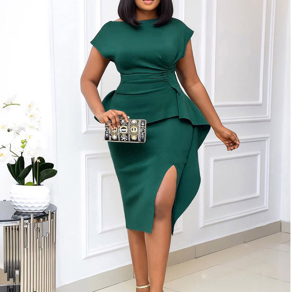 2025 D182 2025 large-size women's clothing popular summer new short-sleeved round neck solid color split-ended tight hip-wrapped Popular trade dress