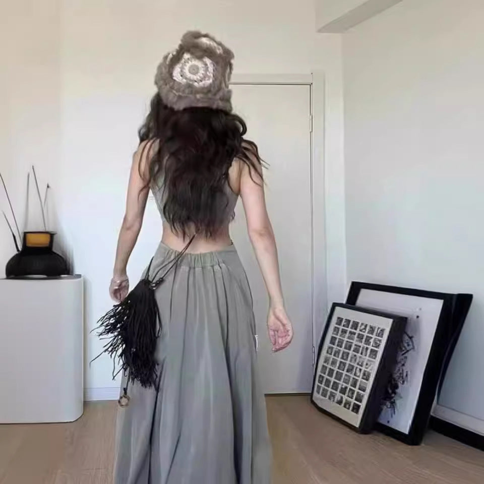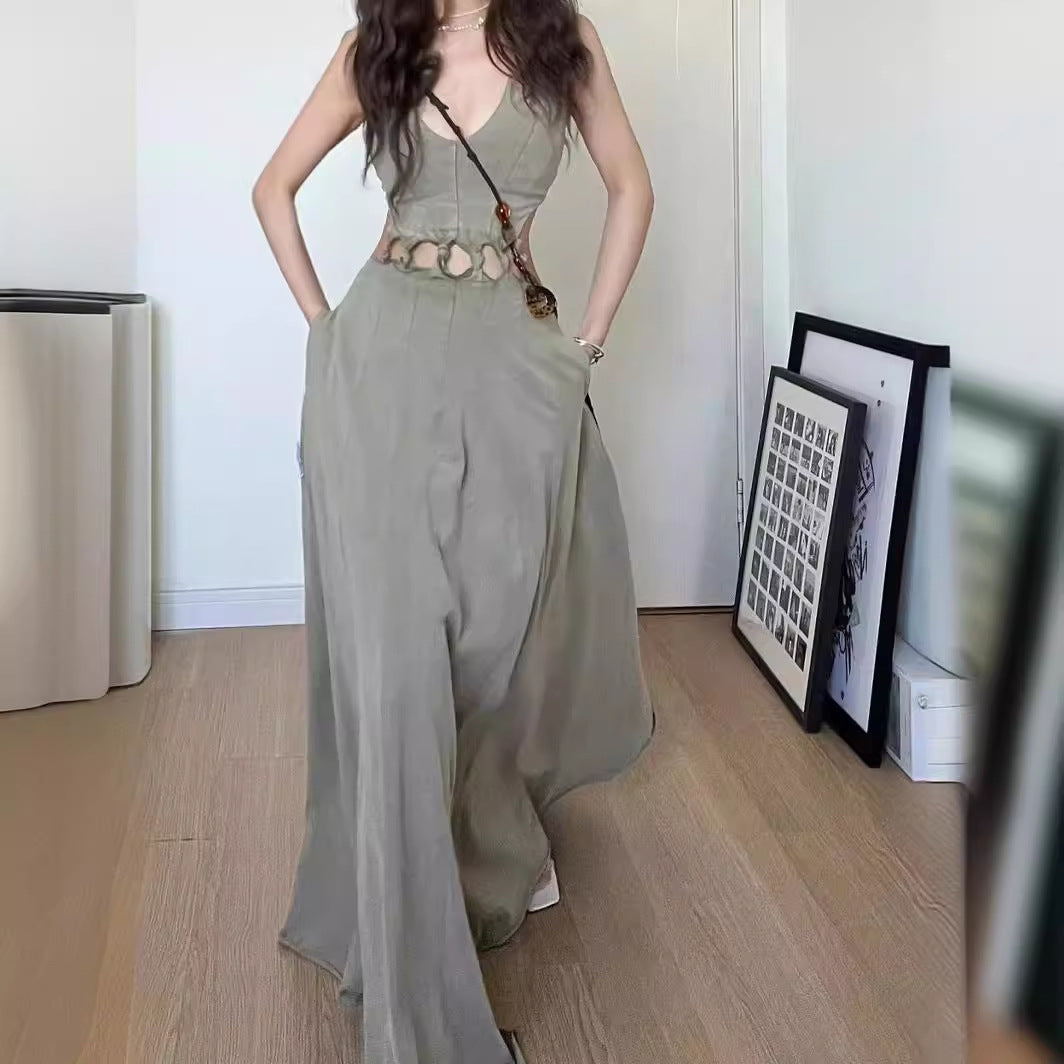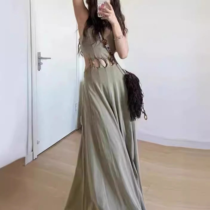 2025 popular summer V-neck niche high-end waist hollow large skirt dress women's floor-mopping dress