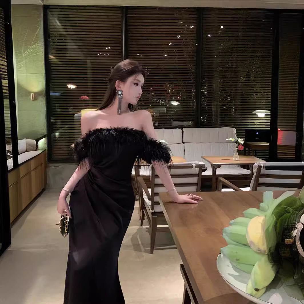 2025 temperament, high-end sense, shoulder dress, women's waist and thin dress, women's fringed design, long skirt