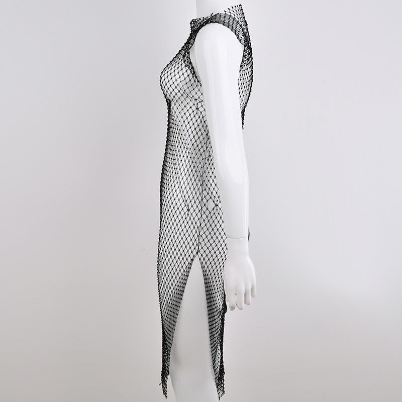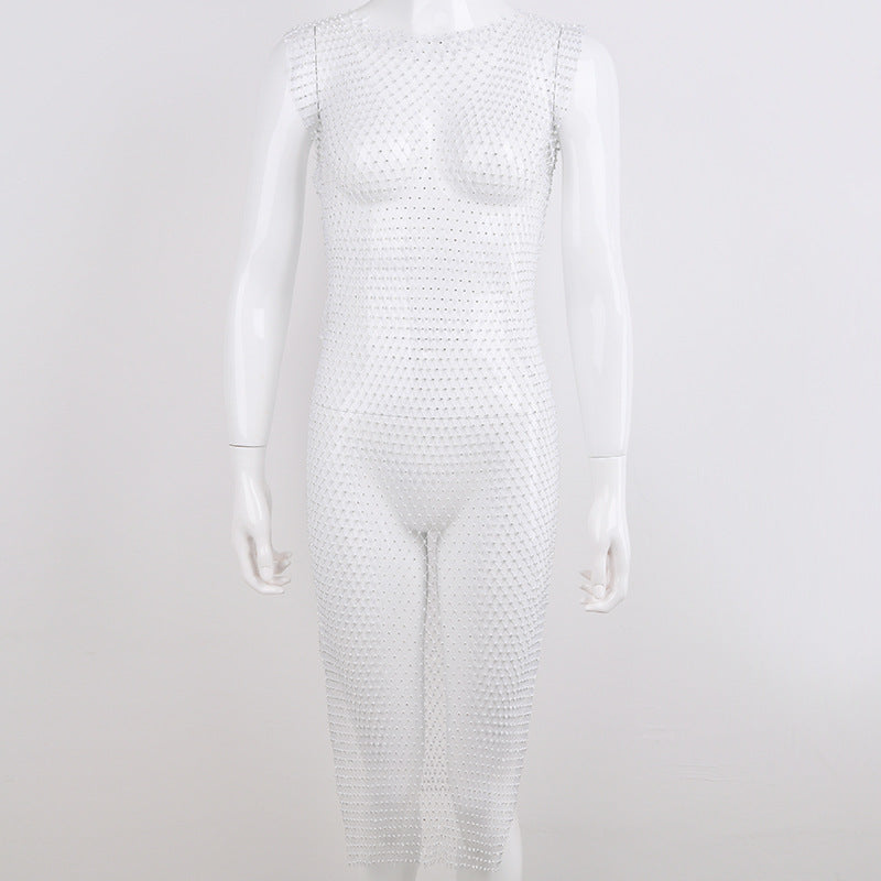 2025 women's clothing sexy one-step skirt autumn new New Popular trade round neck hollow diamond fishing net dress