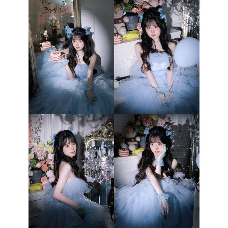 2025Temperament tube top light wedding dress theme wedding dress blue birthday party photo interior photography clothing color yarn