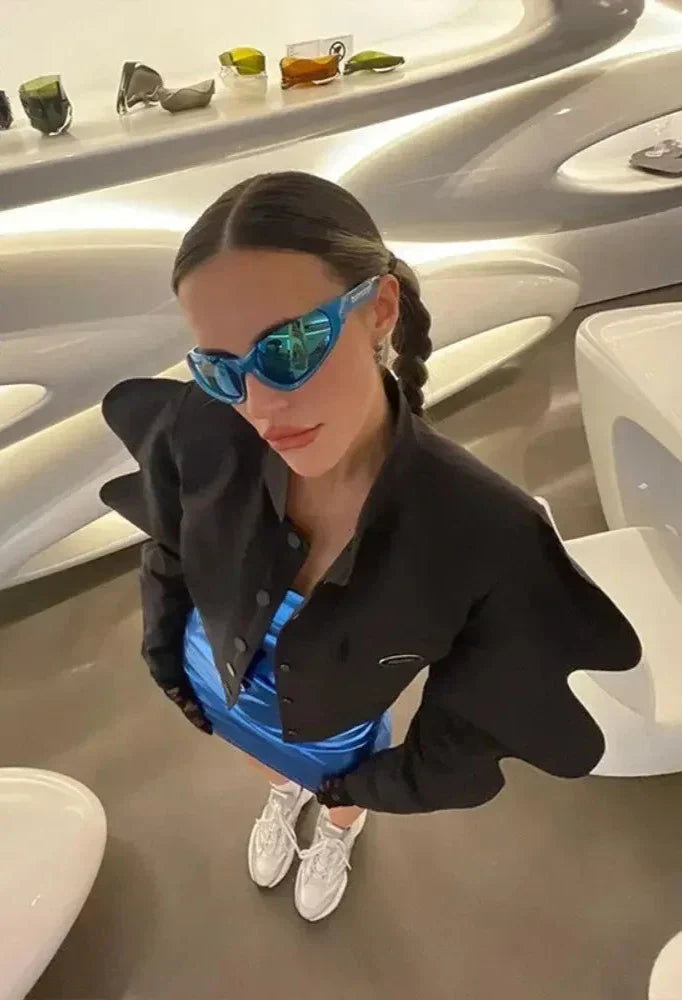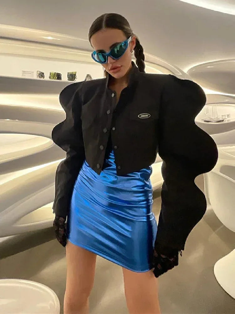 3D Lantern Sleeve Black Cropped Jackets for Women 2023 Fashion Style Cardigan Futuristic Clothing Outerwear C83-DE39