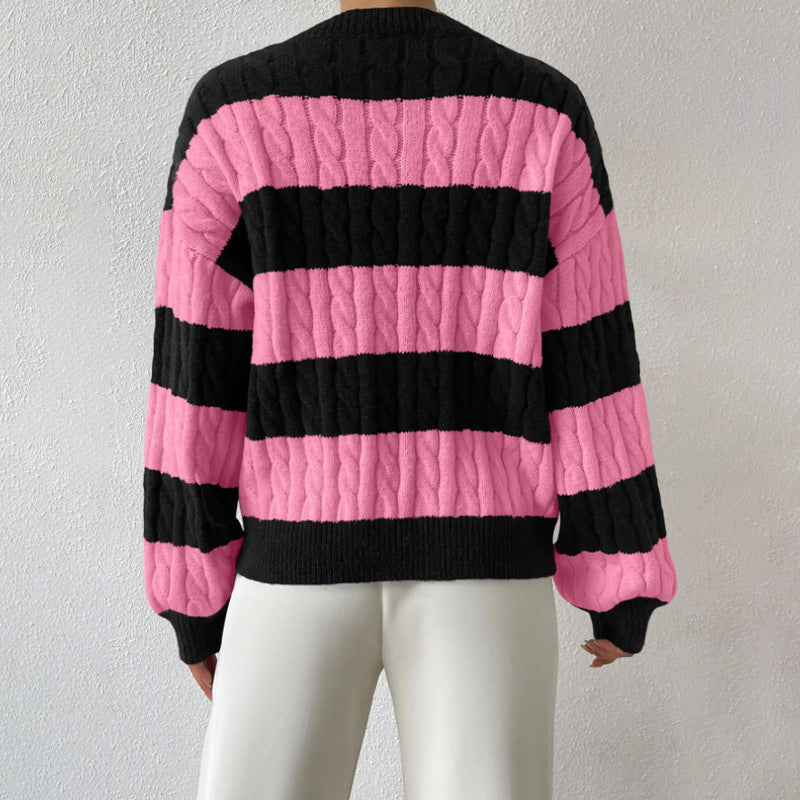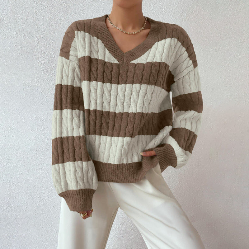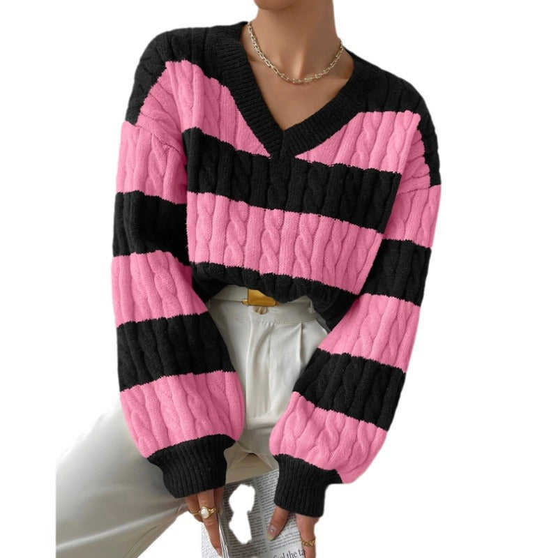 casual fall outfits Autumn and Winter Lazy Style New Knitwear Loose Fashion Women's V-neck Retro Contrast Color Striped Sweater