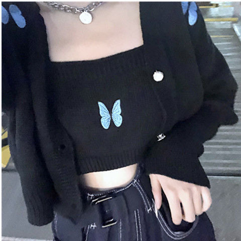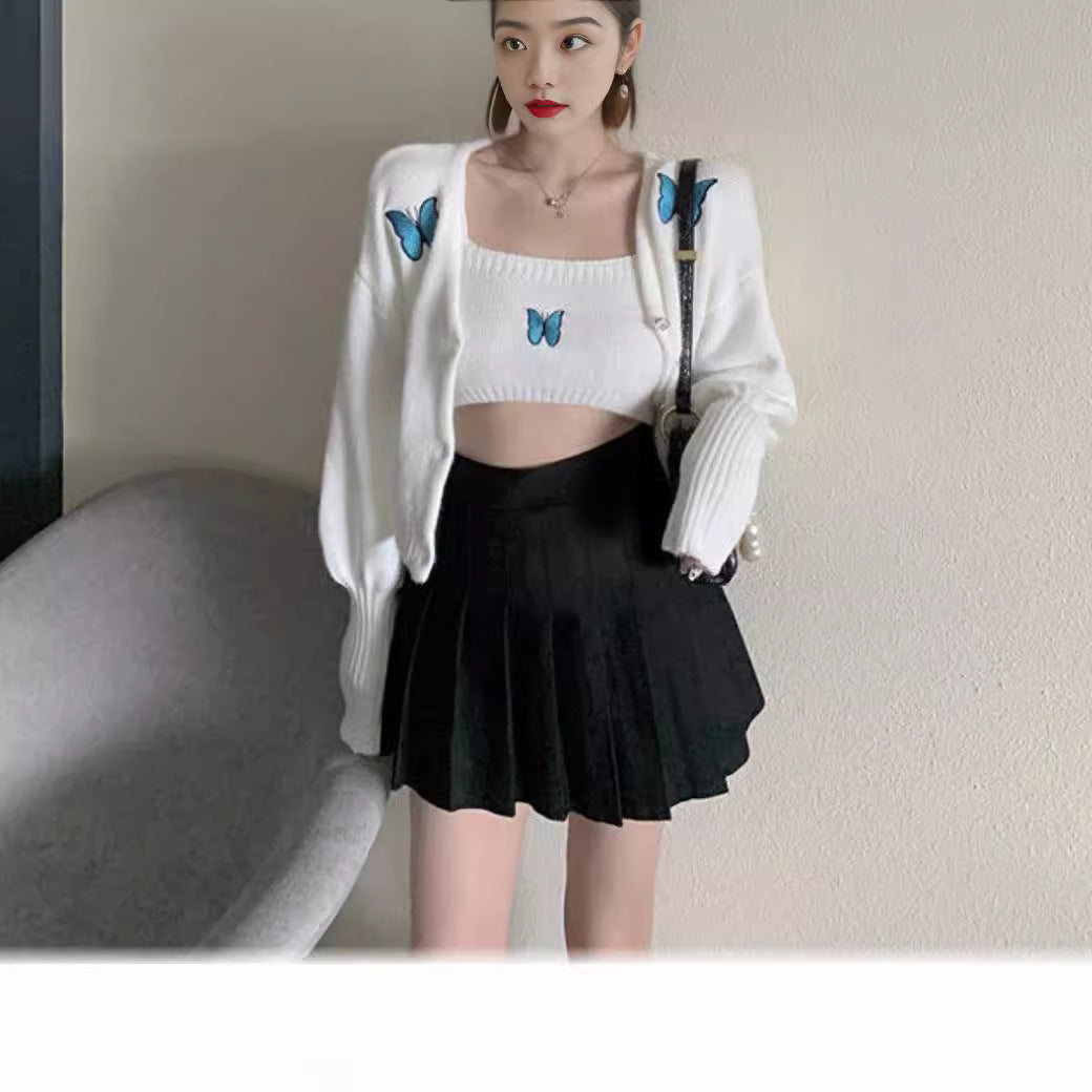 outfit Autumn New Korean Style Preppy Style Butterfly Embroidered Princess Sleeve Short Sling Coat Two-Piece Cardigan for Women