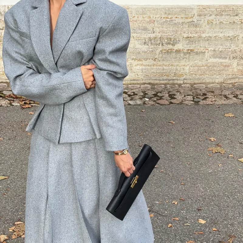 maoxiangshop - 2024 Autumn New Grey Pleated Skirt Set For Women Solid Lapel Collar Blazers High Waist Skirts 2 Pieces Set Lady Party Club Suit