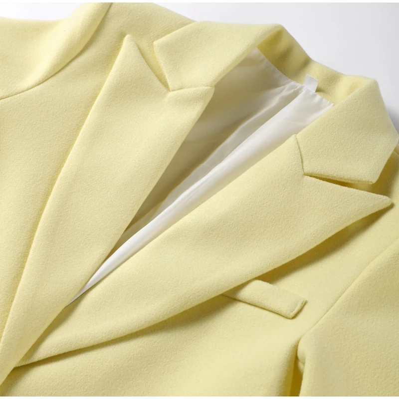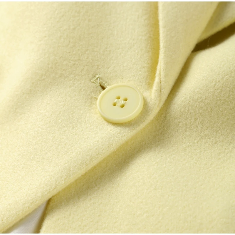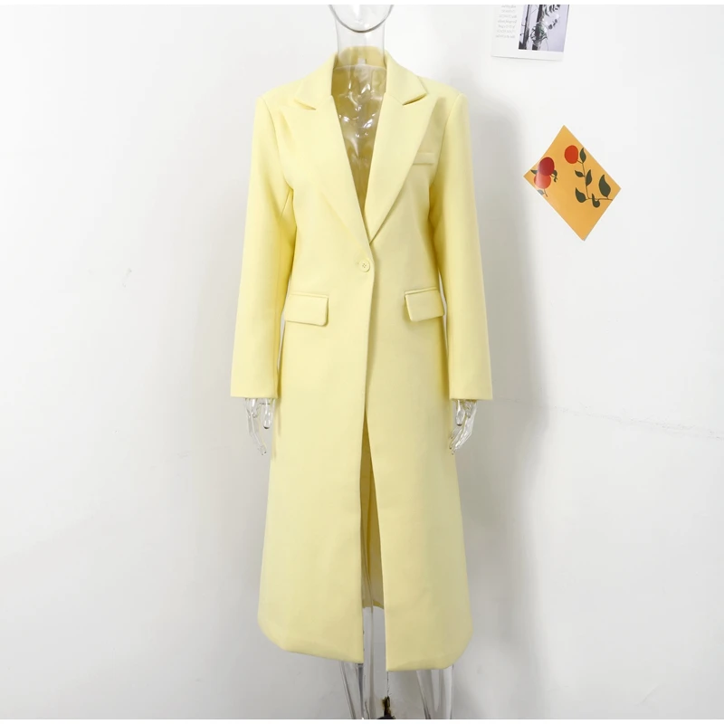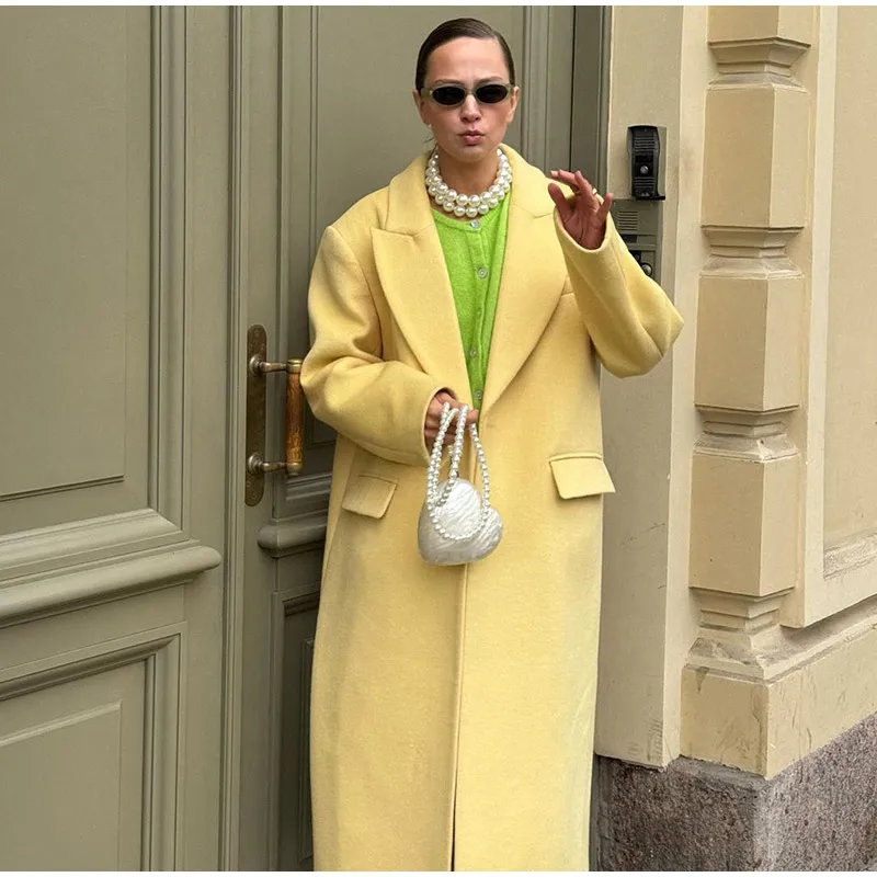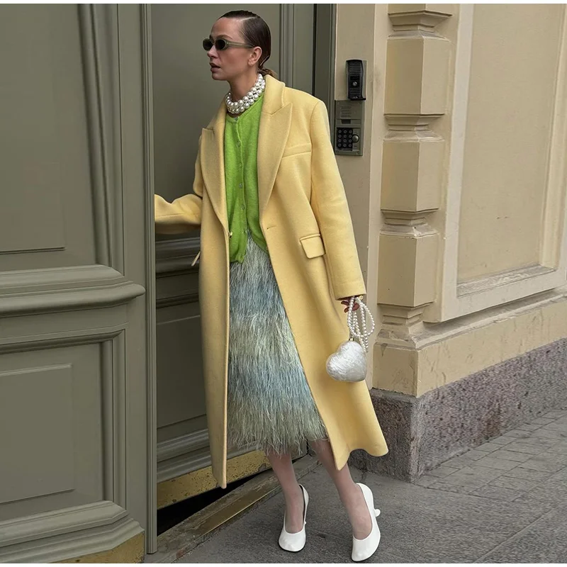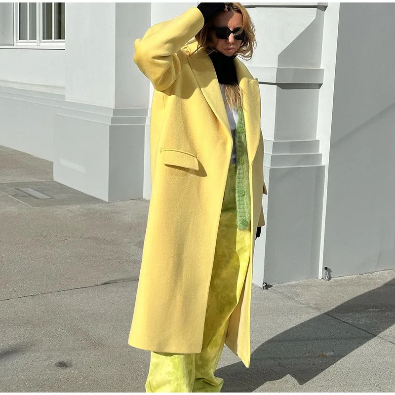 maoxiangshop - Loose Lapel Woolen Long Coats Women Winter Classic Yellow Single Button Pockets Overcoats Female Elegant Casual Street Outwear