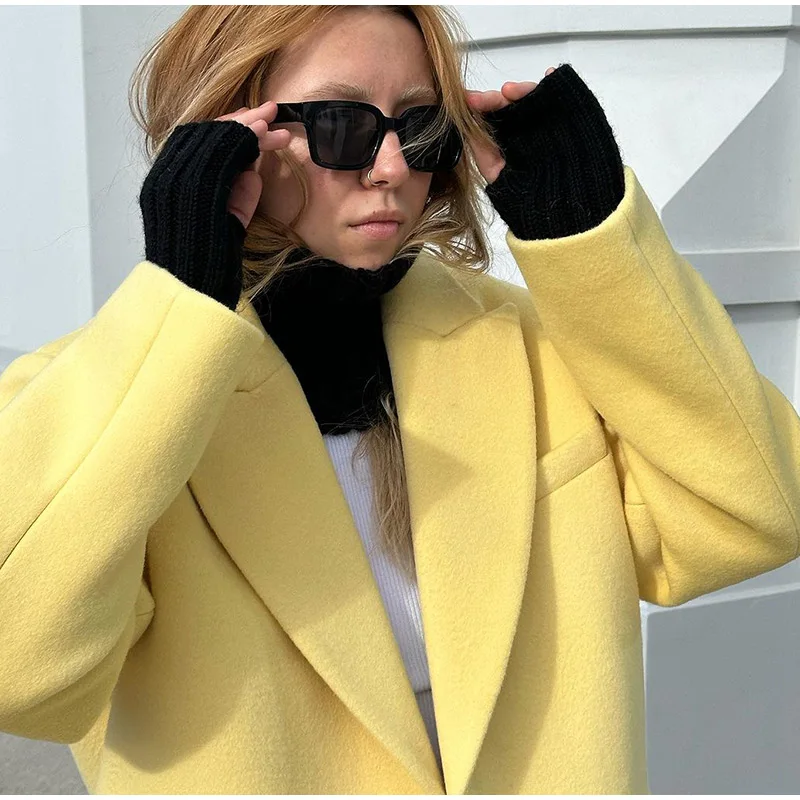 maoxiangshop  -  Loose Lapel Woolen Long Coats Women Winter Classic Yellow Single Button Pockets Overcoats Female Elegant Casual Street Outwear
