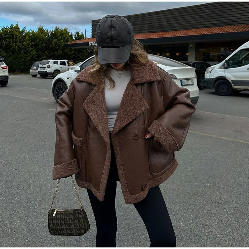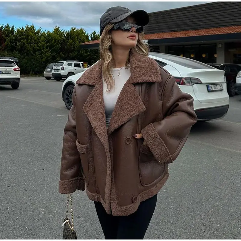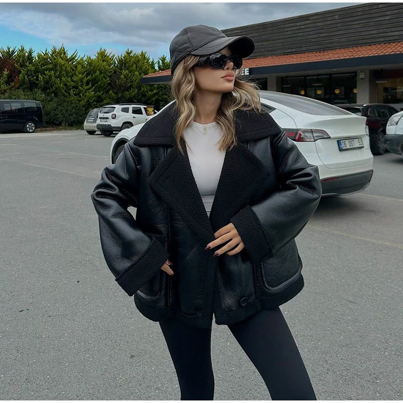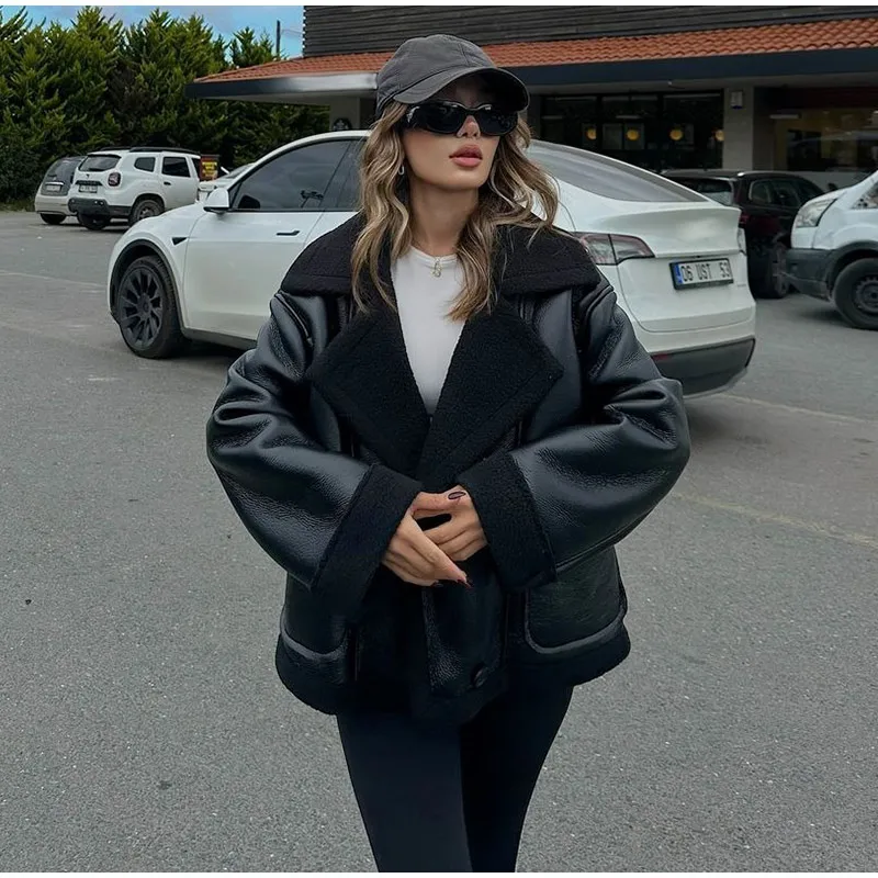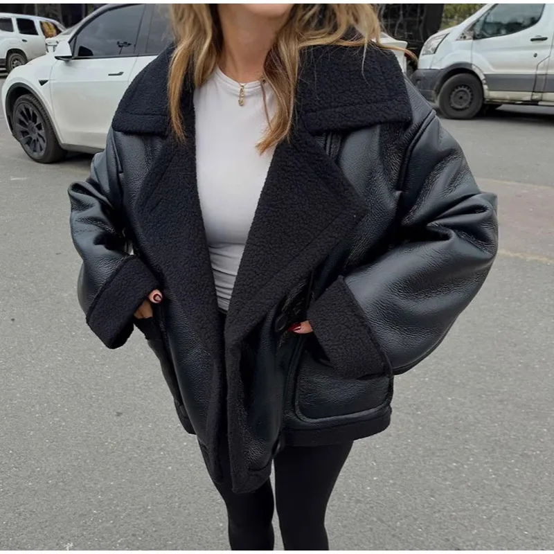 maoxiangshop - Plush Patchwork Lapel PU Leather Jackets Women Casual Loose Long Sleeved Jacket Female Autumn Winter Chic High Street Outwears