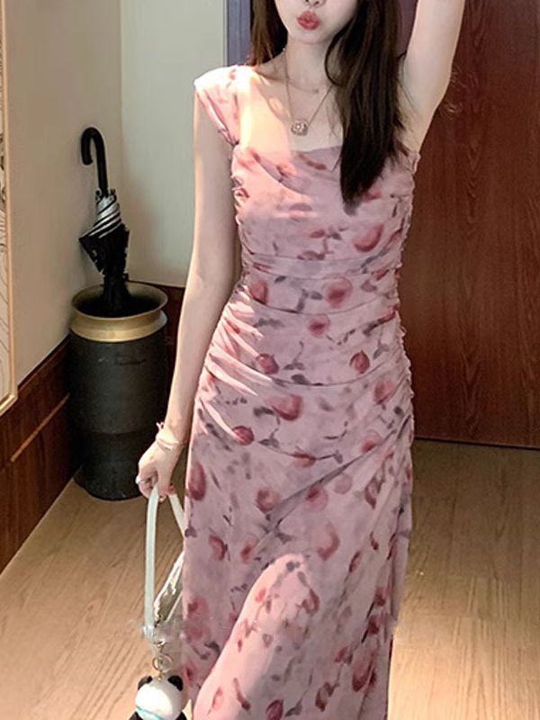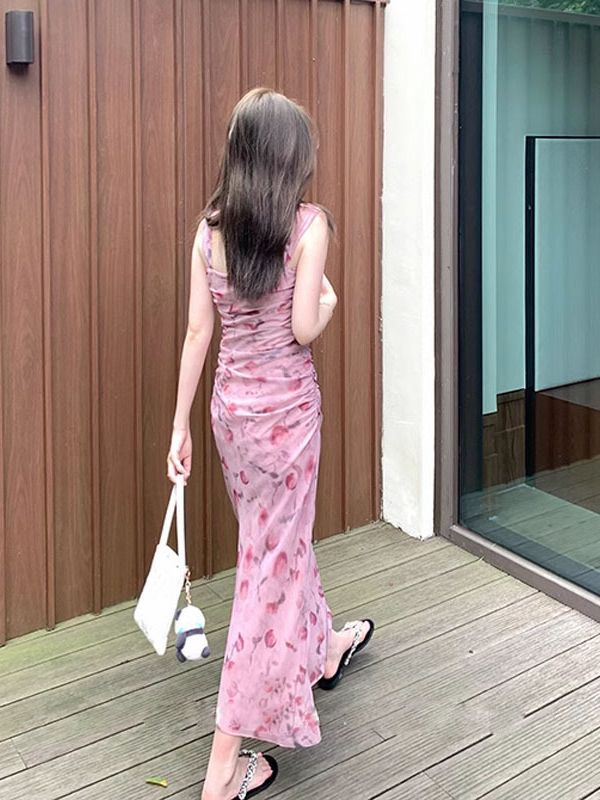 Pink sling floral dress for women summer new long style slim fit waist long dress