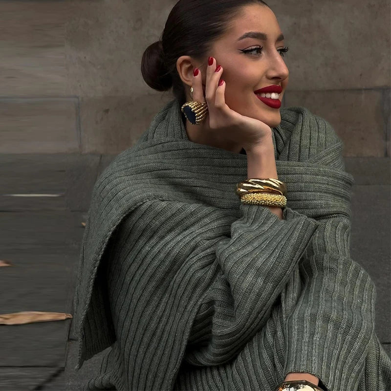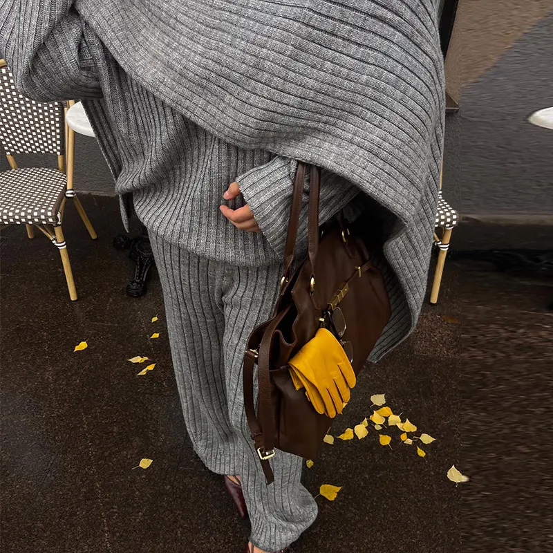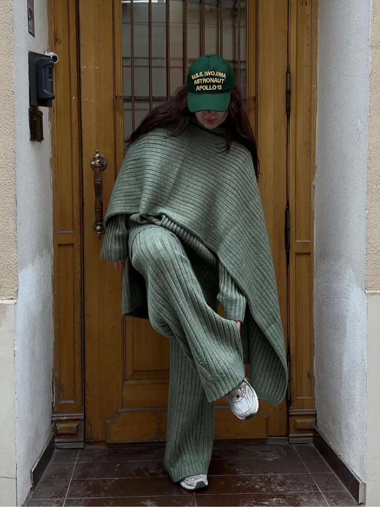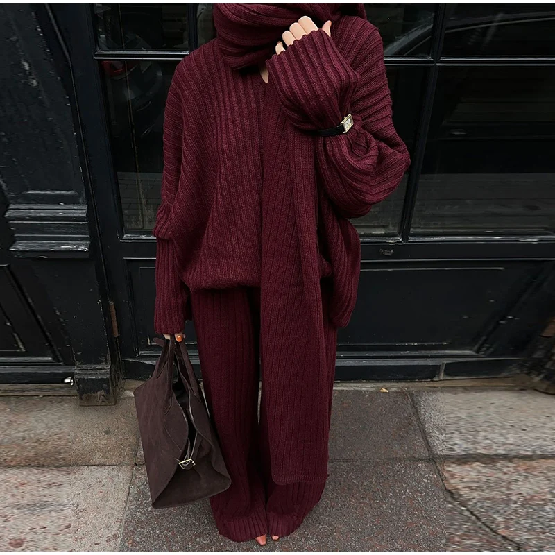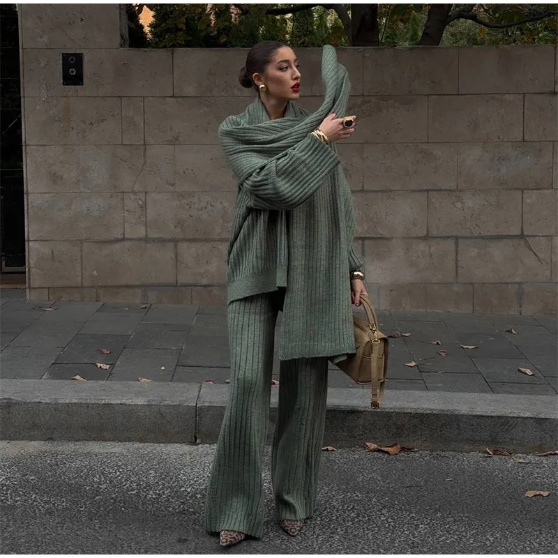 maoxiangshop - Knit Sweater Pants Set With Scarf Women Loose V-neck Long Sleeve Pullover Elastic Wide Leg Trouser Set 2024 Autumn Lady Outfits