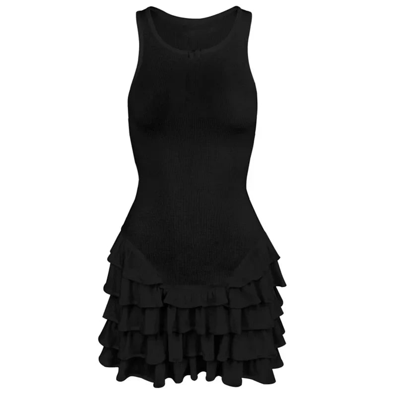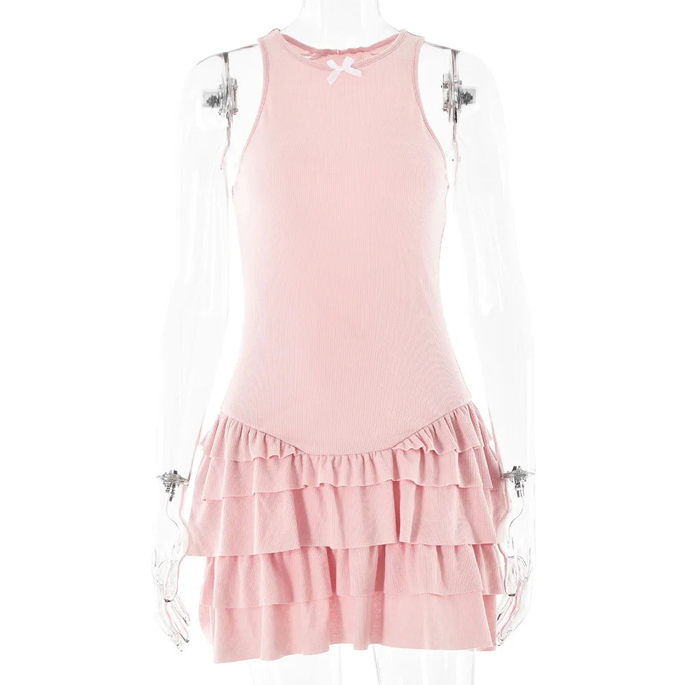 Bow Frill Layer Cake Tank Mini Dress Women U-Neck Patchwork Ruffles Slim Wrap Hip Short Dress Hottie Summer Beachwear