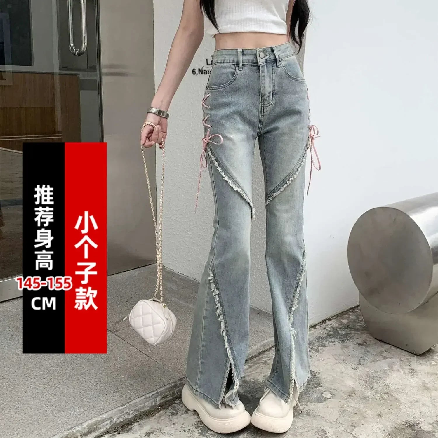 American Split Jeans Women Pink Bandage High Waist Irregular Spliced Denim Pants Zipper Fly Trousers Y2k Pantalon Femme