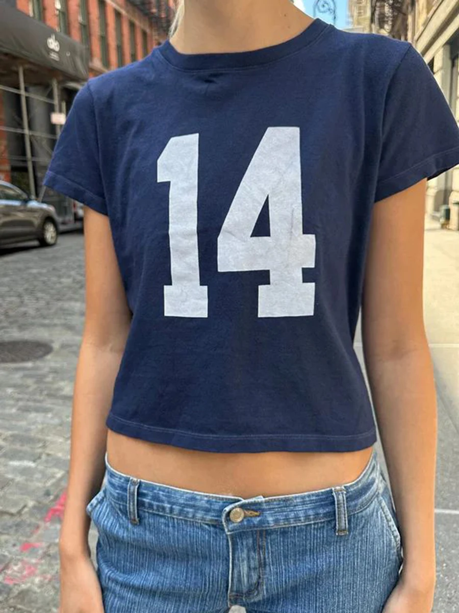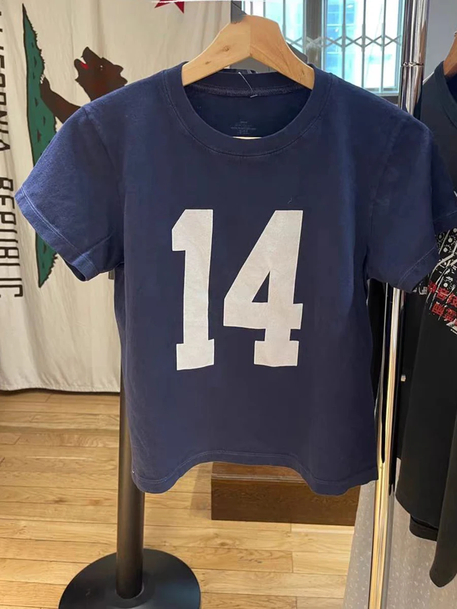 American Vintage 14 Print Navy T-shirts Summer Round Neck Short Sleeve Cotton Cropped Tees Streetwear Casual Basic Pullovers Top