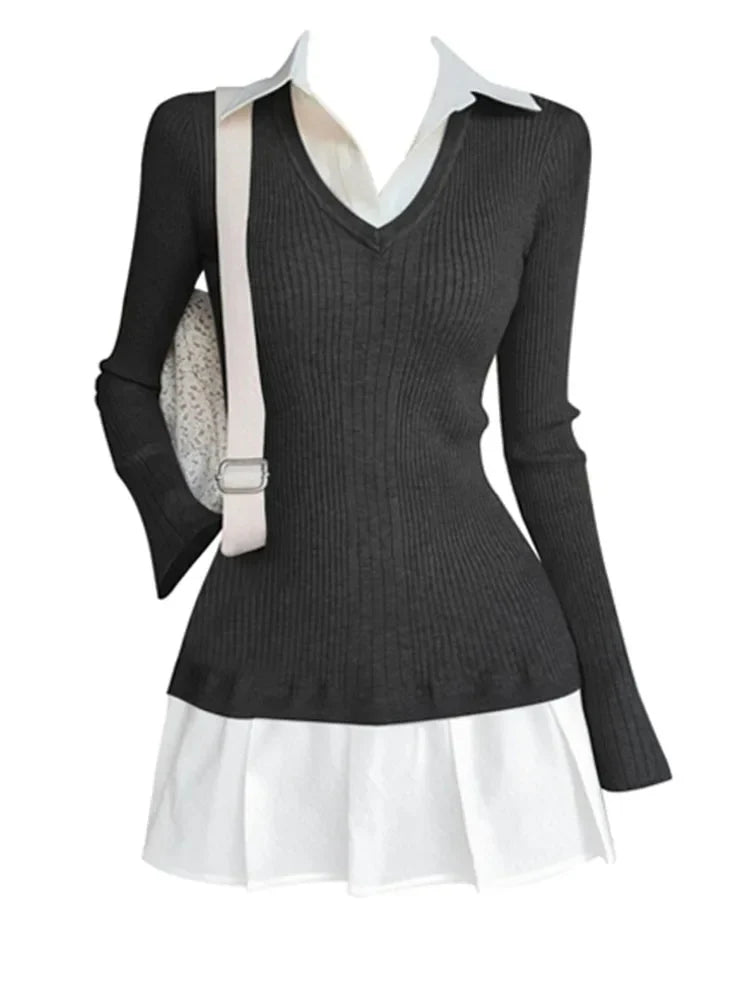 maoxiangshop Autumn Winter Preppy Style Fake Two Pieces Mini Knit Shirts Dress Women Gyaru 2000s Aesthetic Vintage Long Sleeve One-Piece