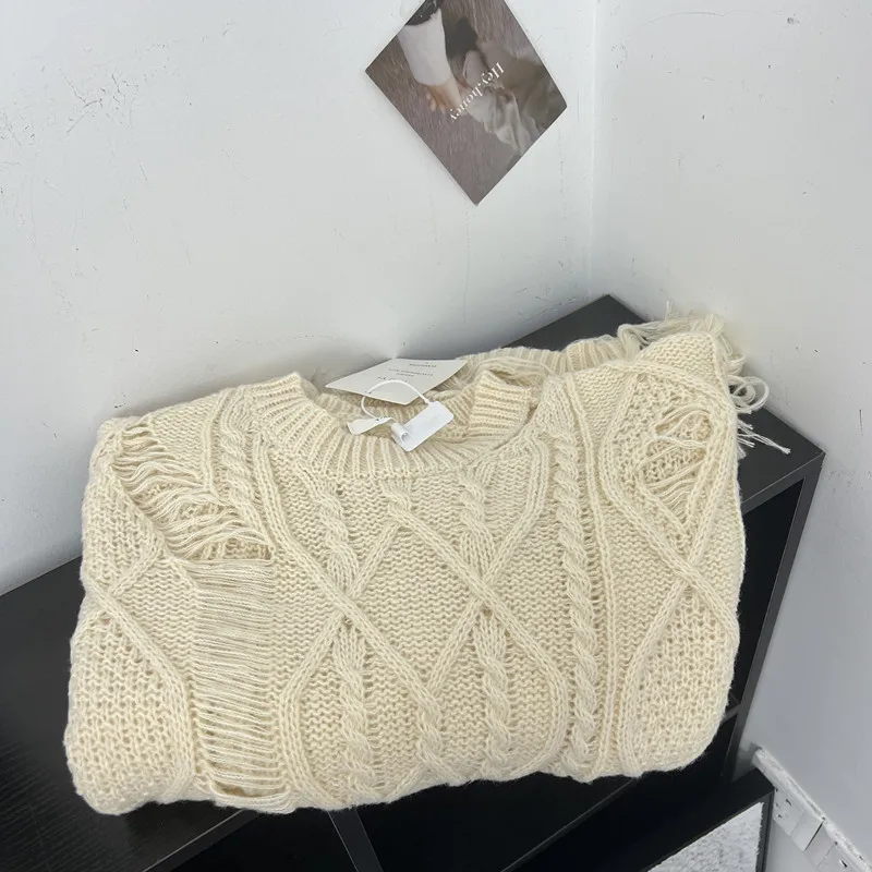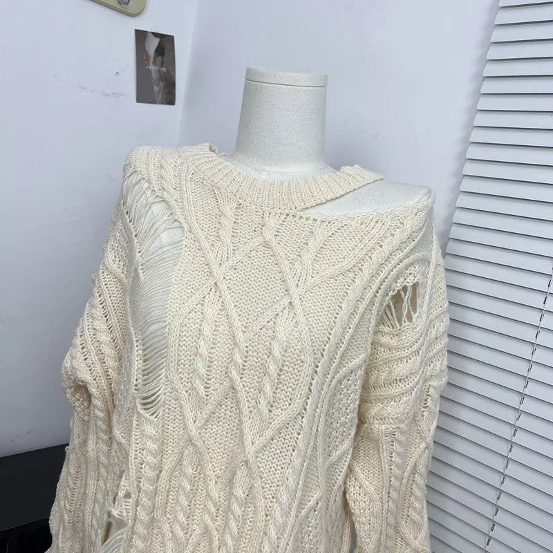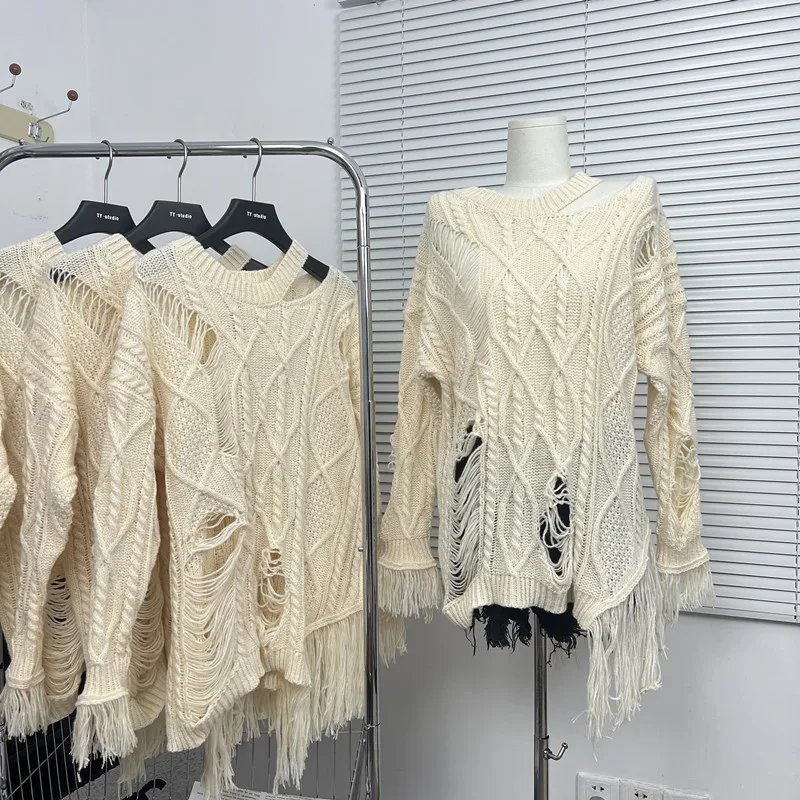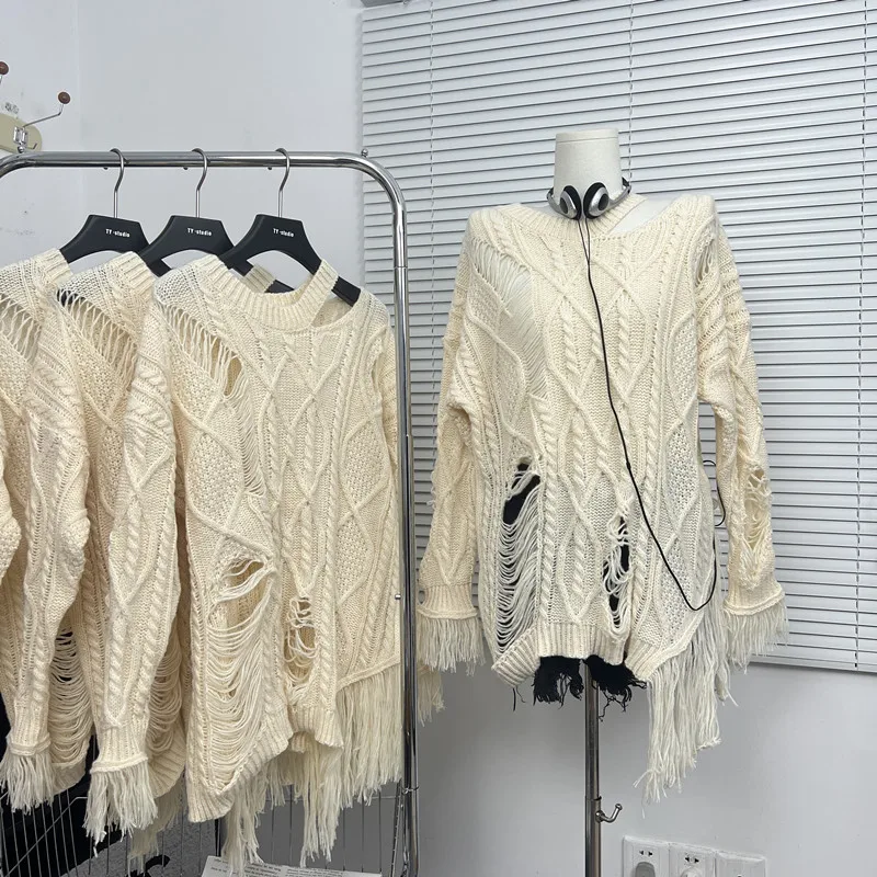 Autumn Winter Woman Vintage Goth Long Sleeve Baddie Style Jumper Harajuku Sweater Hole Tassel Jerseys Oversize Y2k Streetwear
