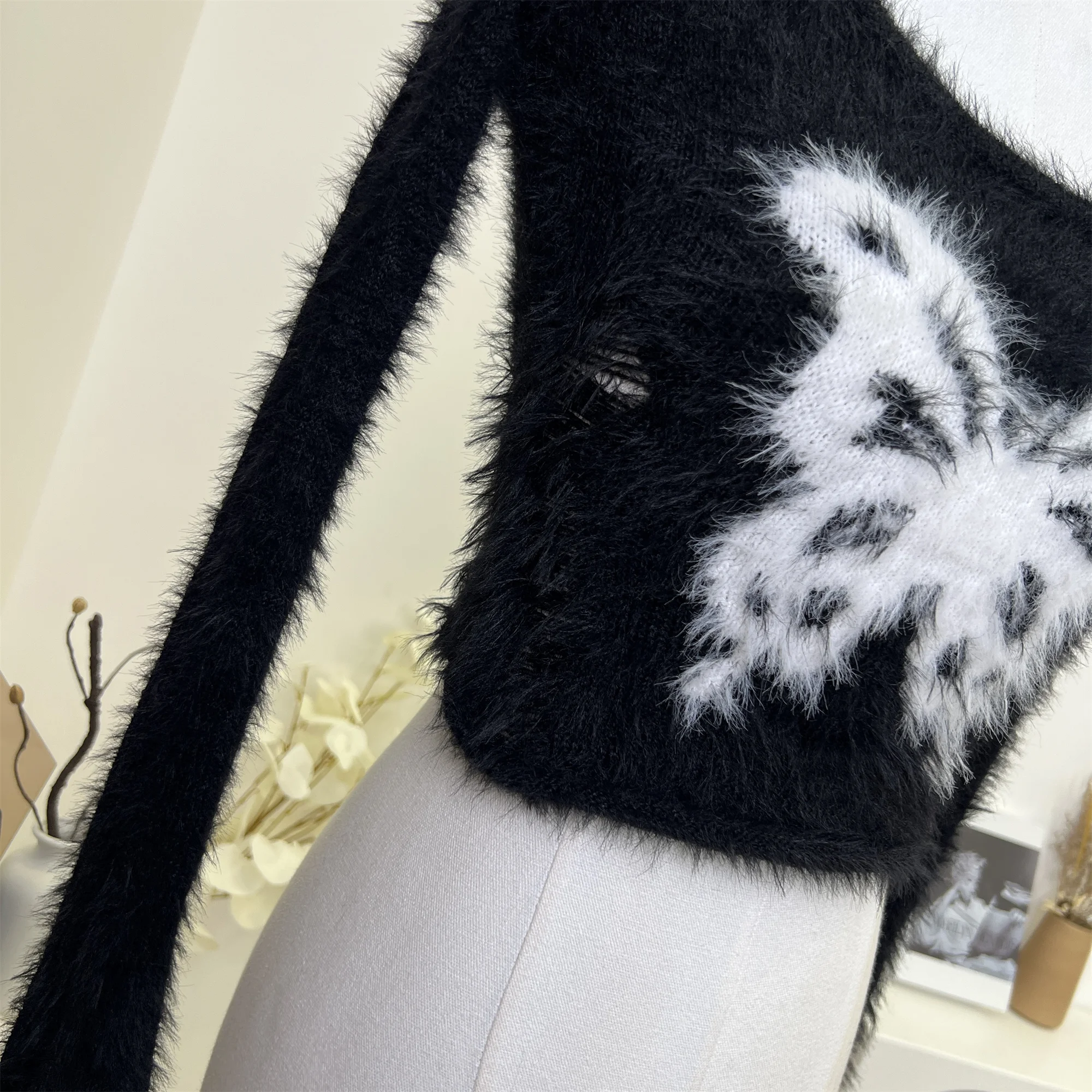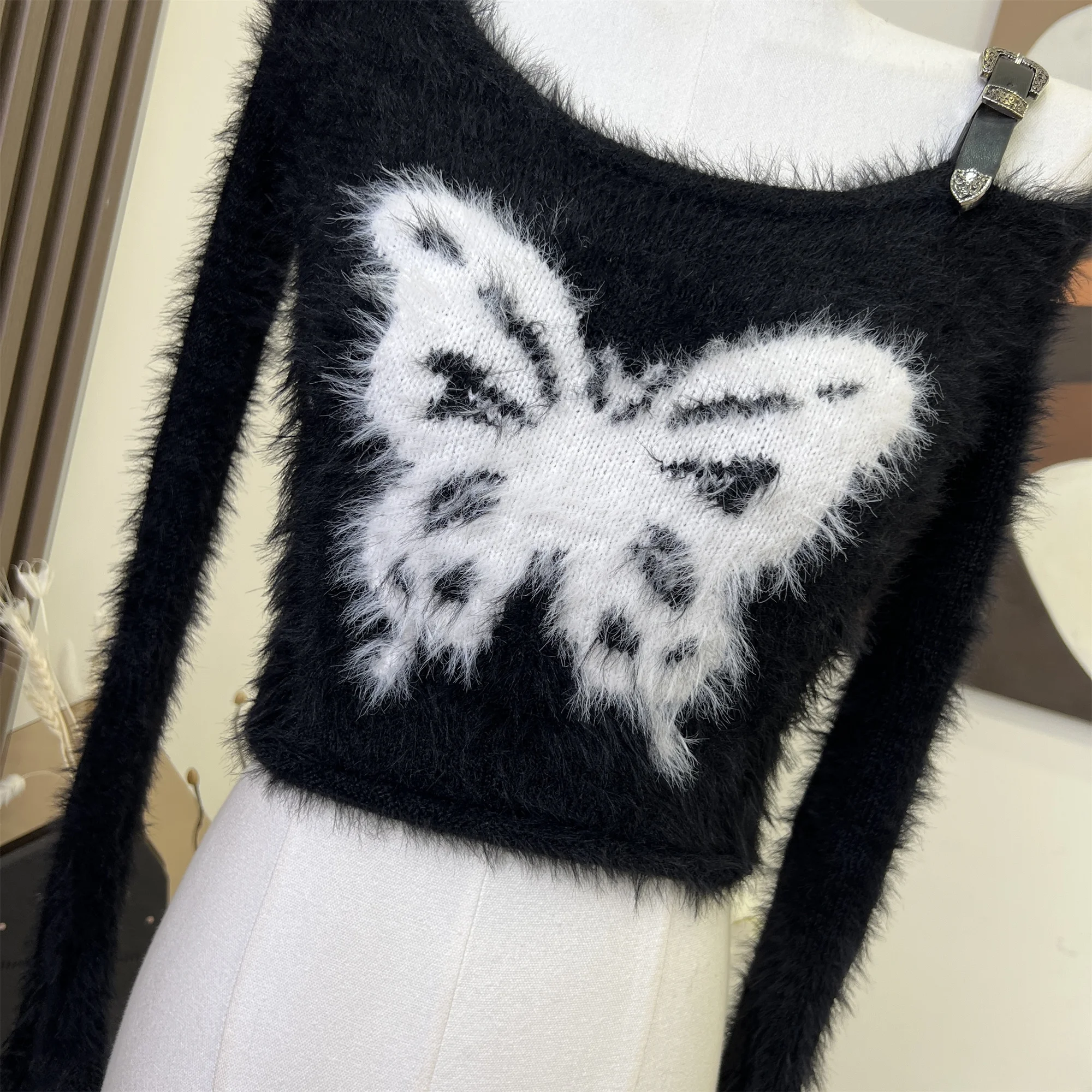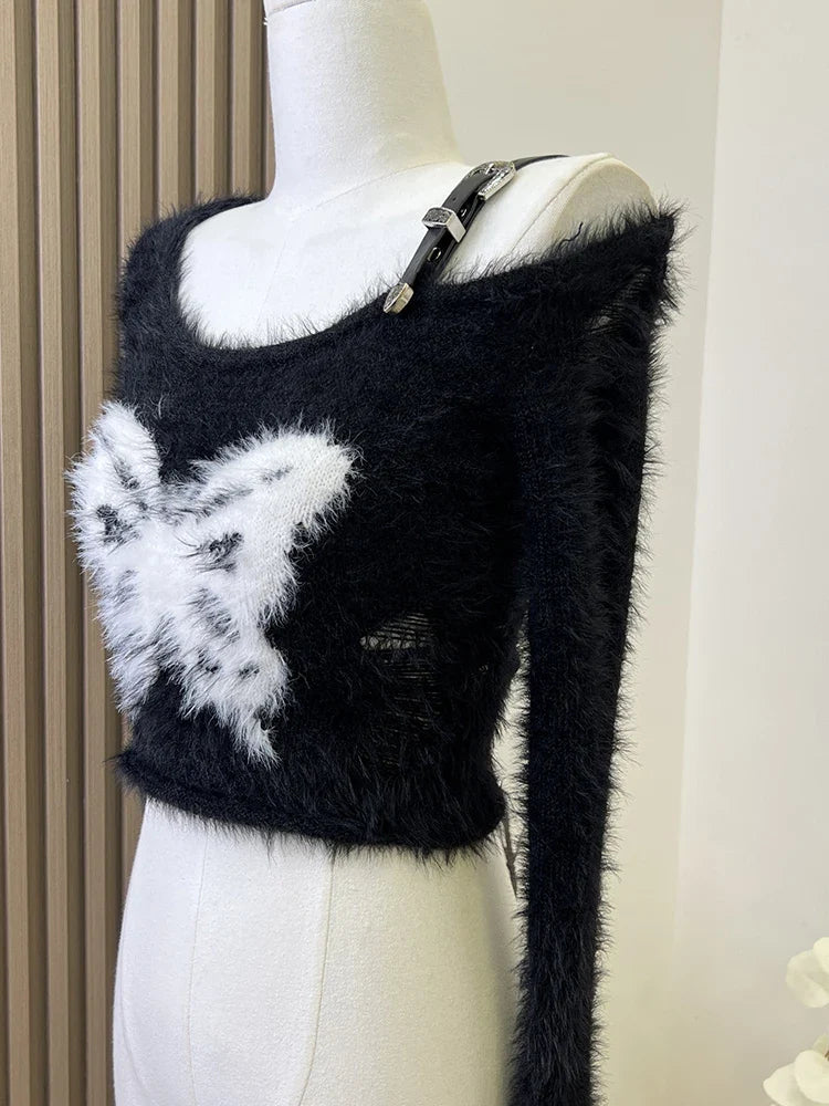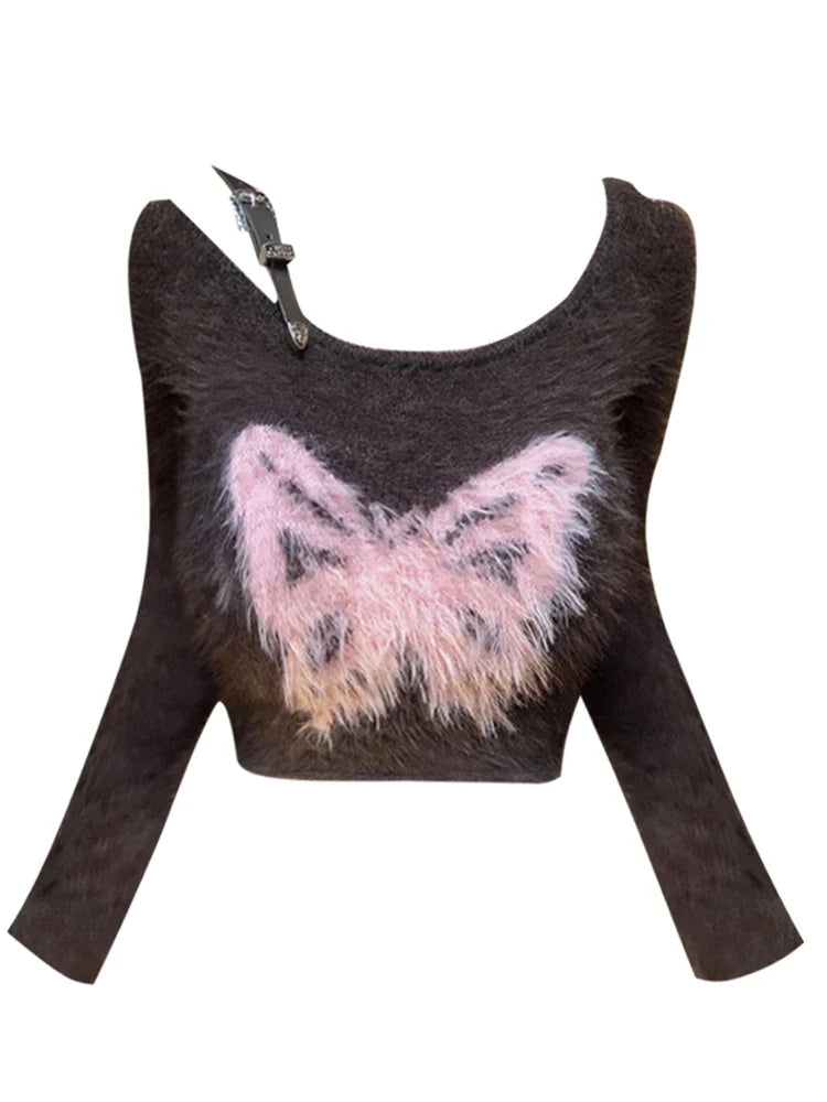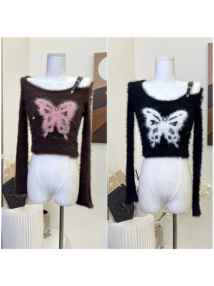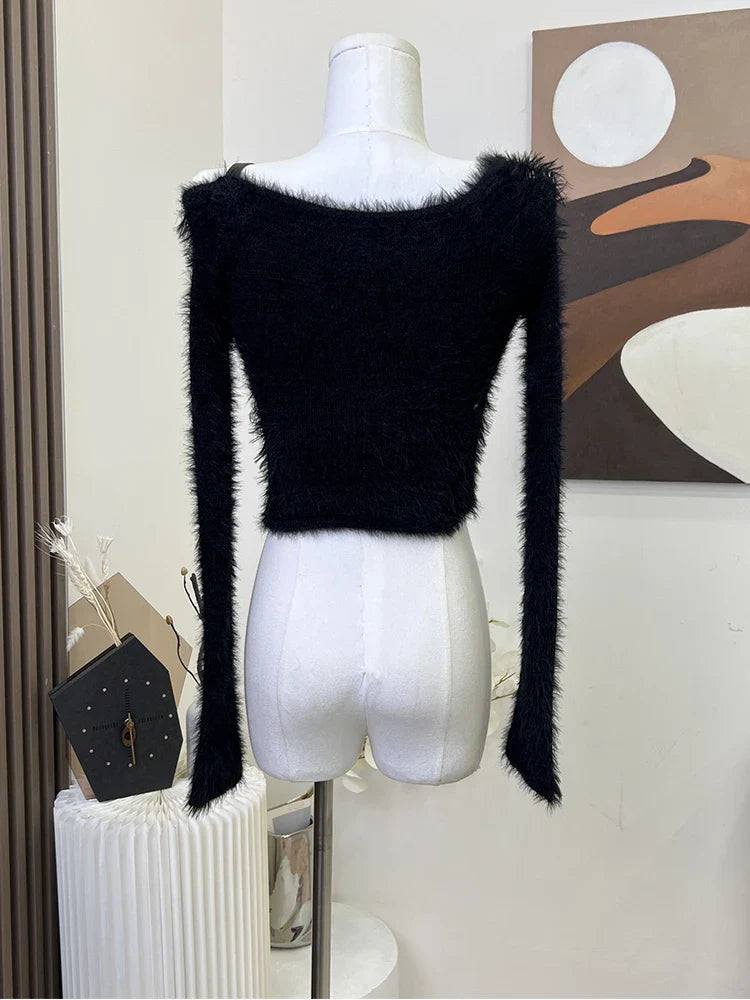 Autumn Woman Vintage Harajuku Fashion Gothic Crop Top Off Shoulder Jumper Tide O-Neck Fluffy Sweater Long Sleeve 2000s Aesthetic