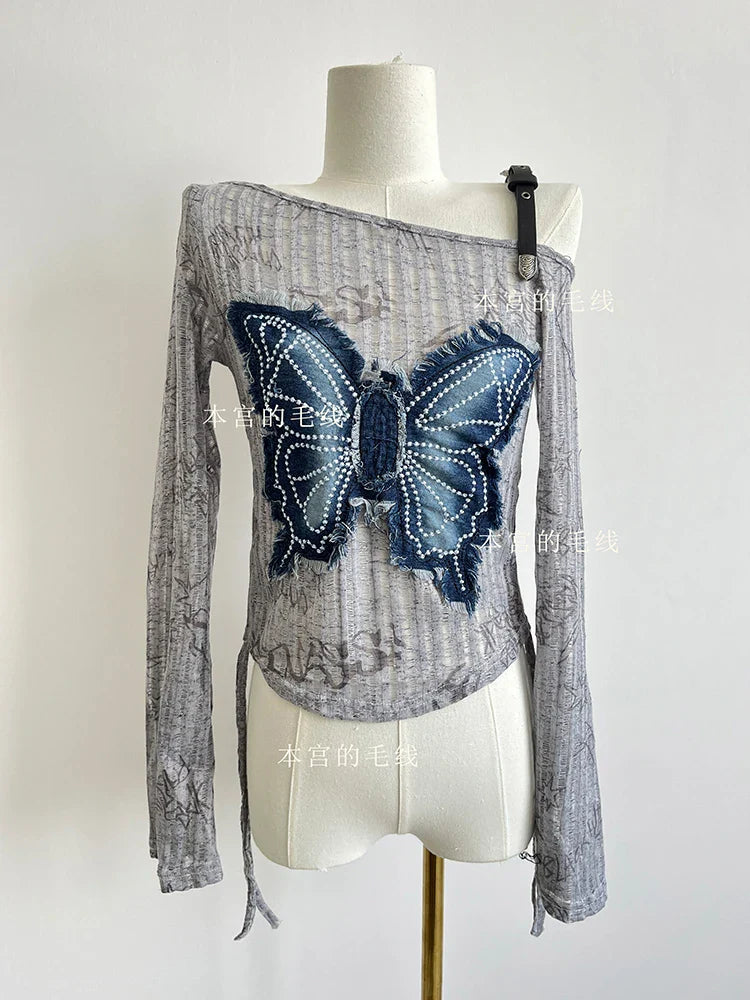 Autumn Women Design Japanese Fashion Lace Up T-Shirts Gothic Harajuku Tees 2000s Cyber Off Shoulder Crop Tops Gyaru Y2k Grunge