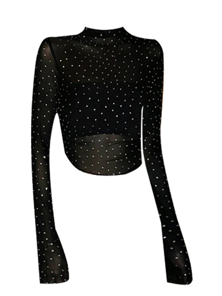 Autumn Women Harajuku Fashion Gyaru Gauze T-Shirts Rhinestone Tees Long Sleeve See Through Coquette Crop Tops Grunge Trashy Y2k