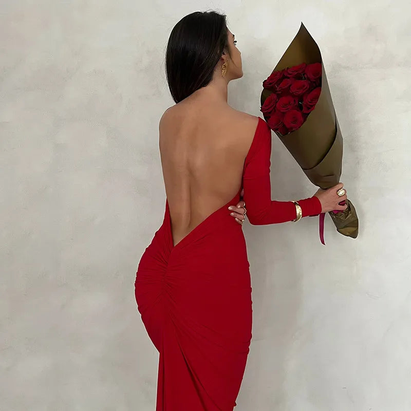 maoxiangshop Backless Maxi Dress Elegant Red Long Sleeve Sexy Ruched Bodyocn Evening Party Dress for Women Spring Slim Christmas Outfits