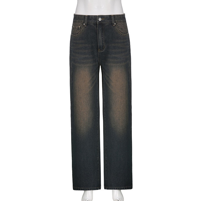 maoxiangshop Baggy Straight Leg Pants Women¡¯s Jeans Vintage Mid Waist Fit Washed Denim Pants Hotgirls Streetwear Grunge Clothes