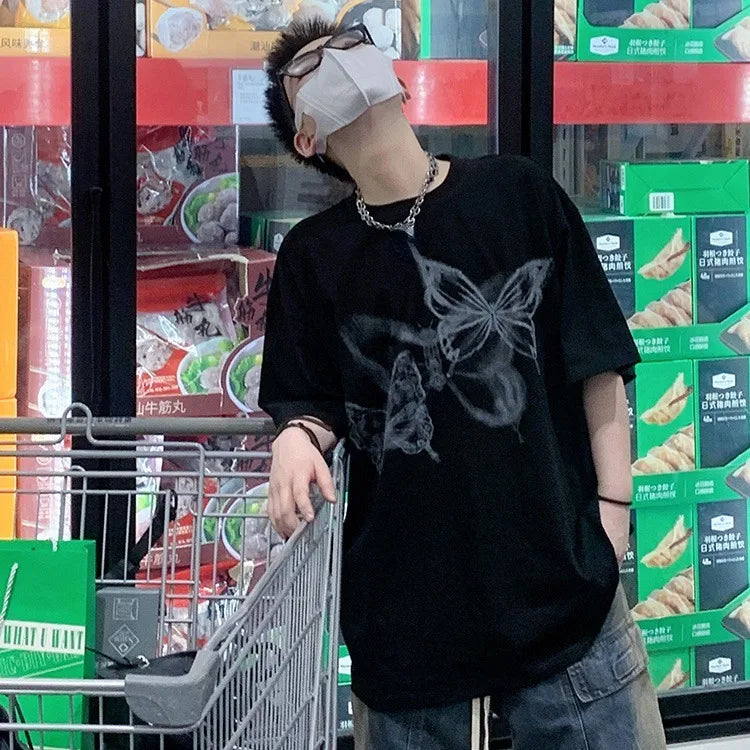 Black Butterfly Print Couples T-shirts Summer Sexy Off Shoulder Unisex Tee Shirt Y2k E-Girl Slim Fit Short Sleeve Tops Women