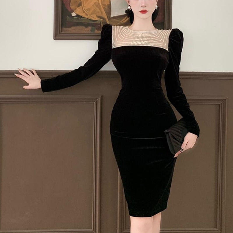maoxiangshop Black Elegant Evening Midi Dress Women Bodycon France Vintage Velvet Party Dress Ladies Korean Fashion Chic Dresses Autumn