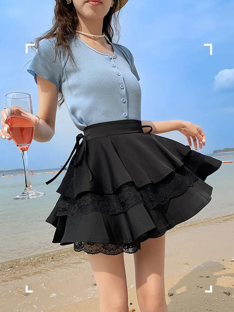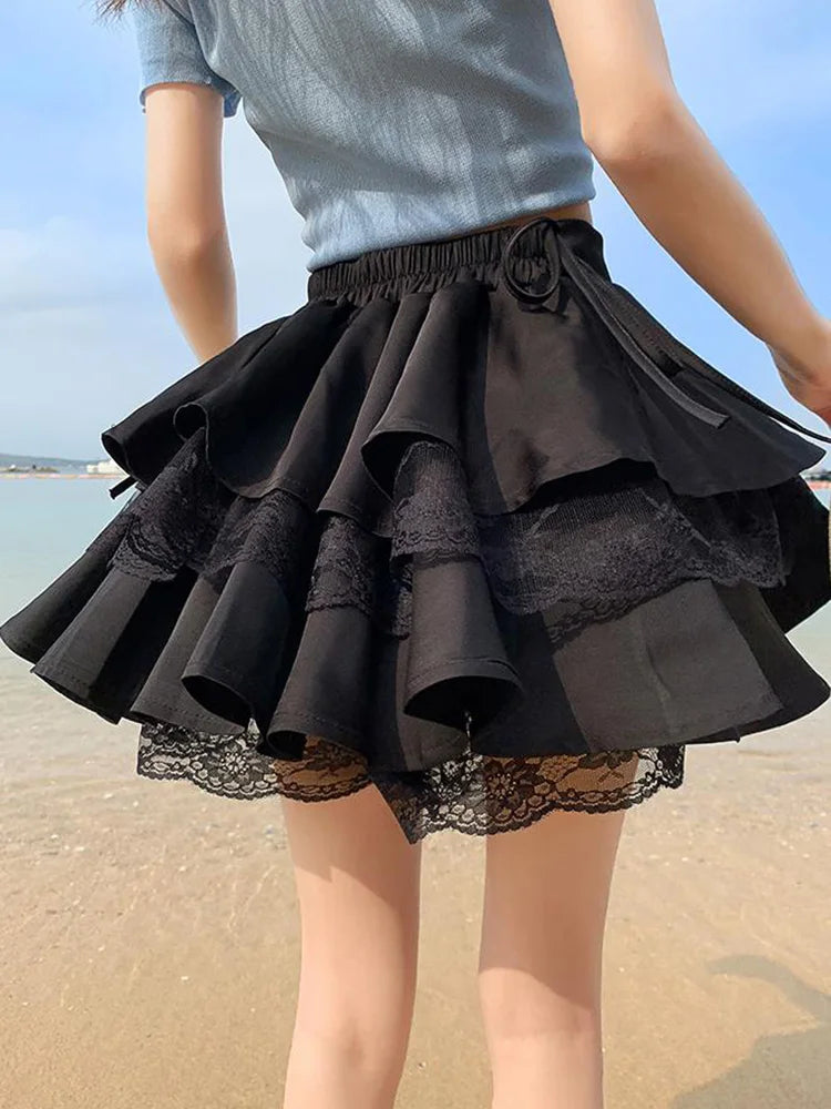Black Patchwork Lace Short Women Cake Skirt With Lace Up High Waist Preppy Style Cute Ball Gown Kawaii Skirts Girls