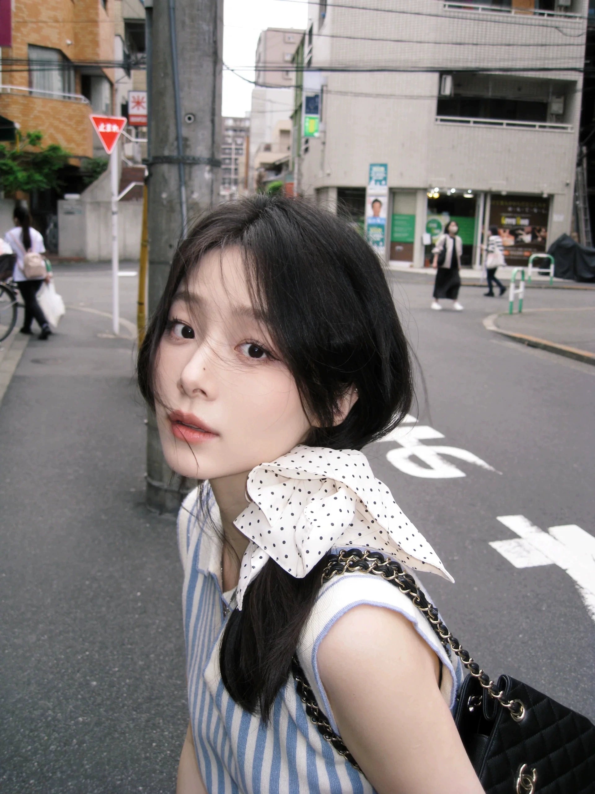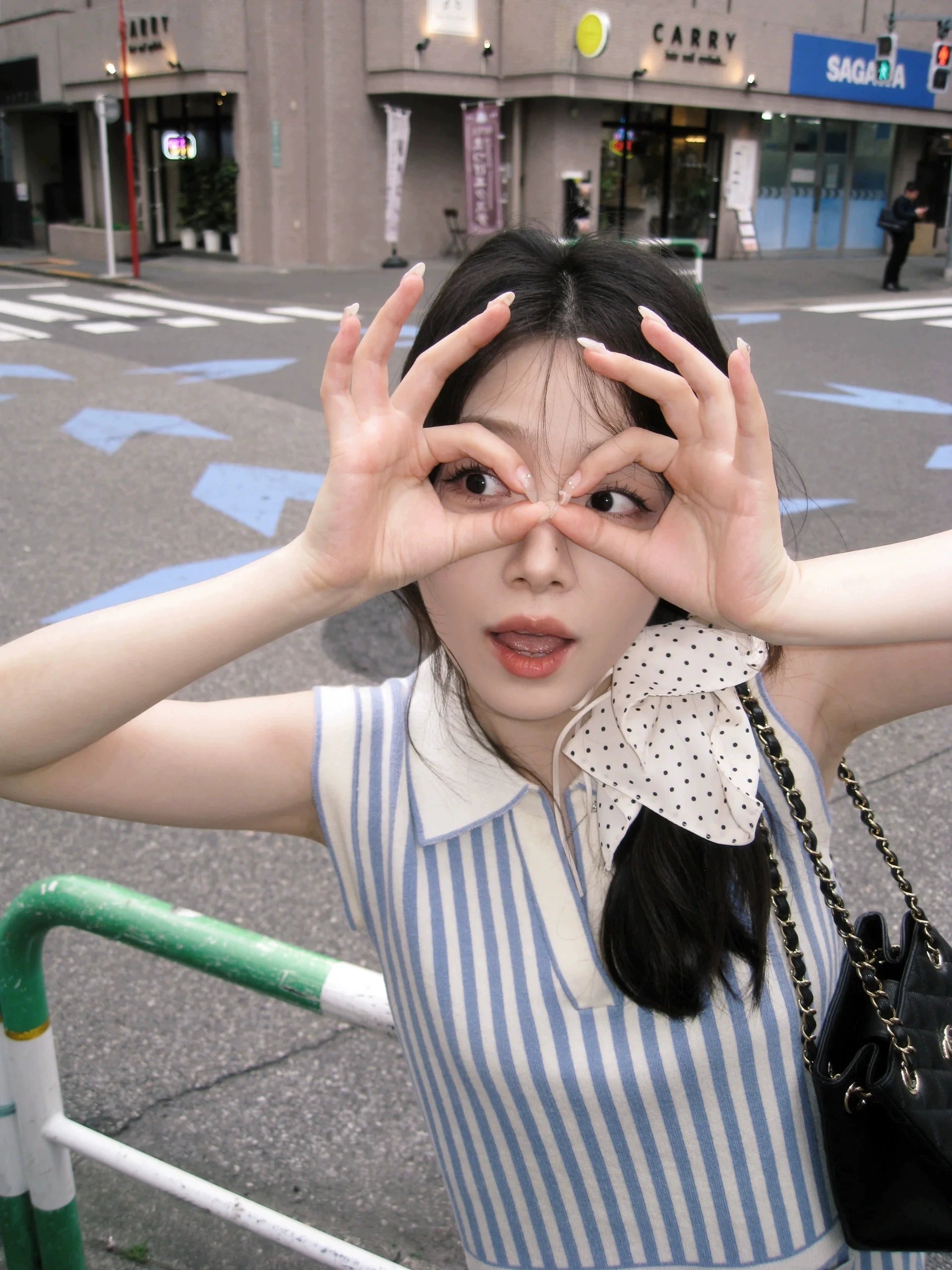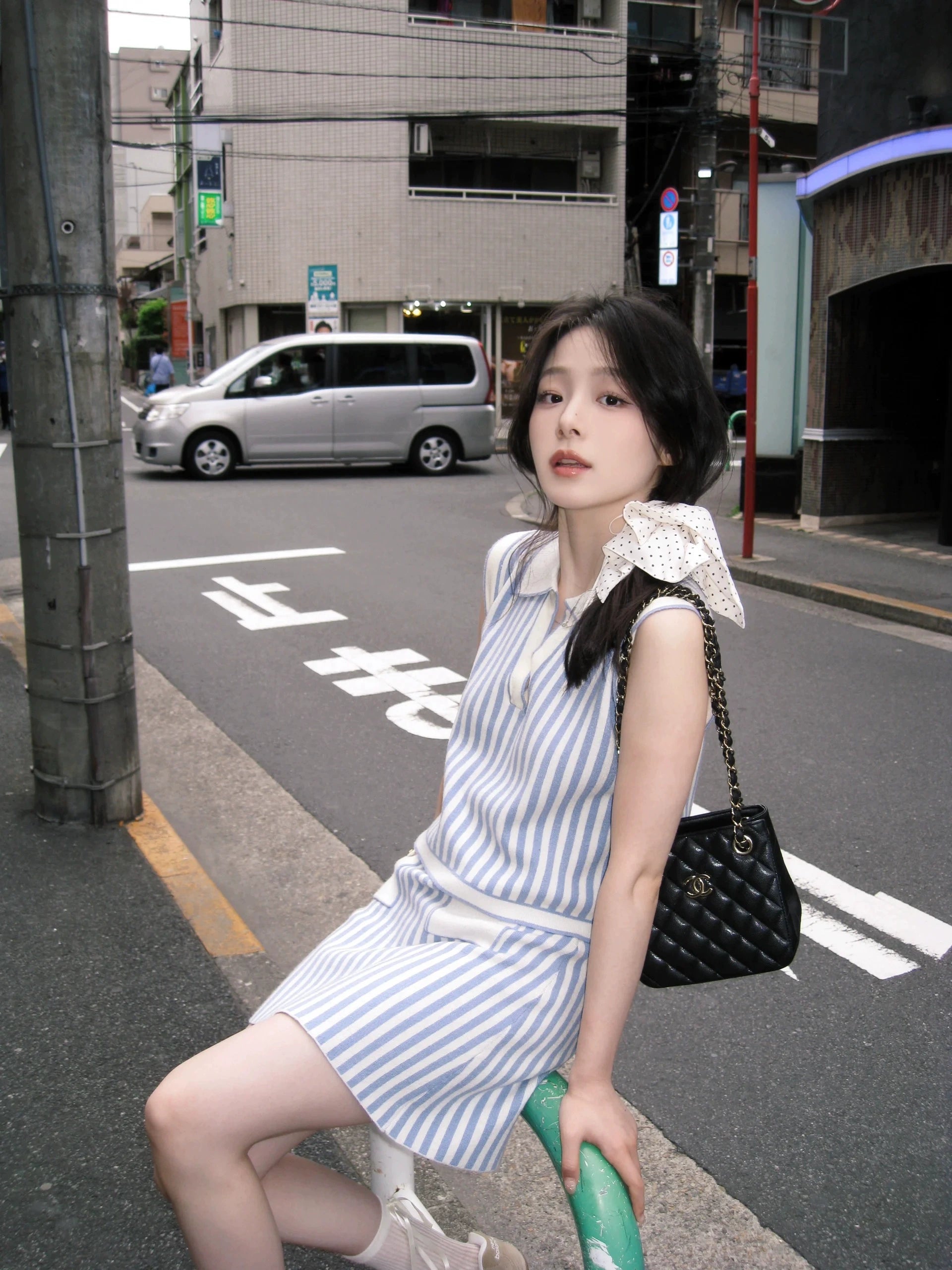 Blue and white vertical stripe knitted suit women's new sea salt mint blue polo neck sleeveless vest top skirt