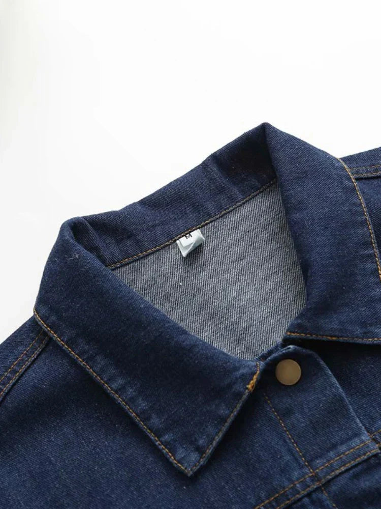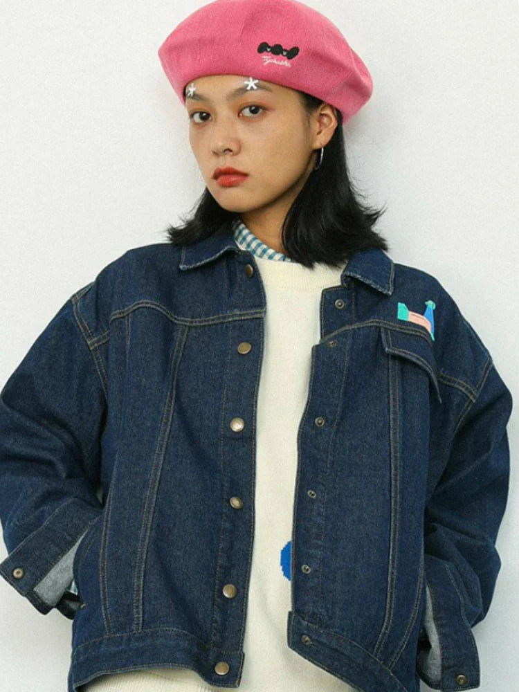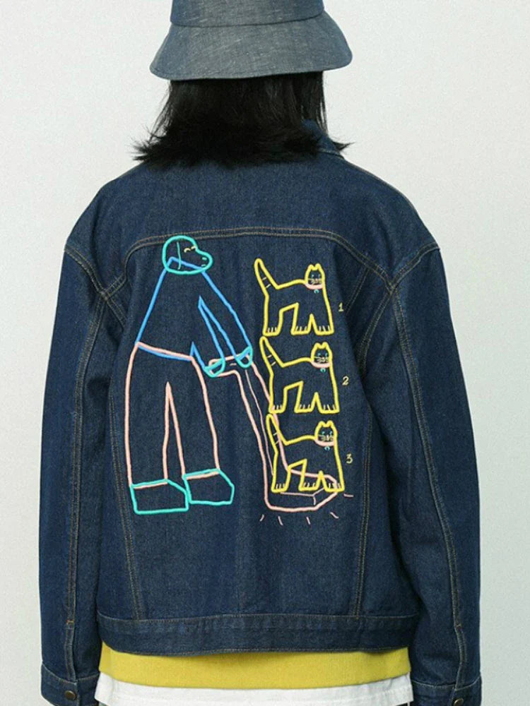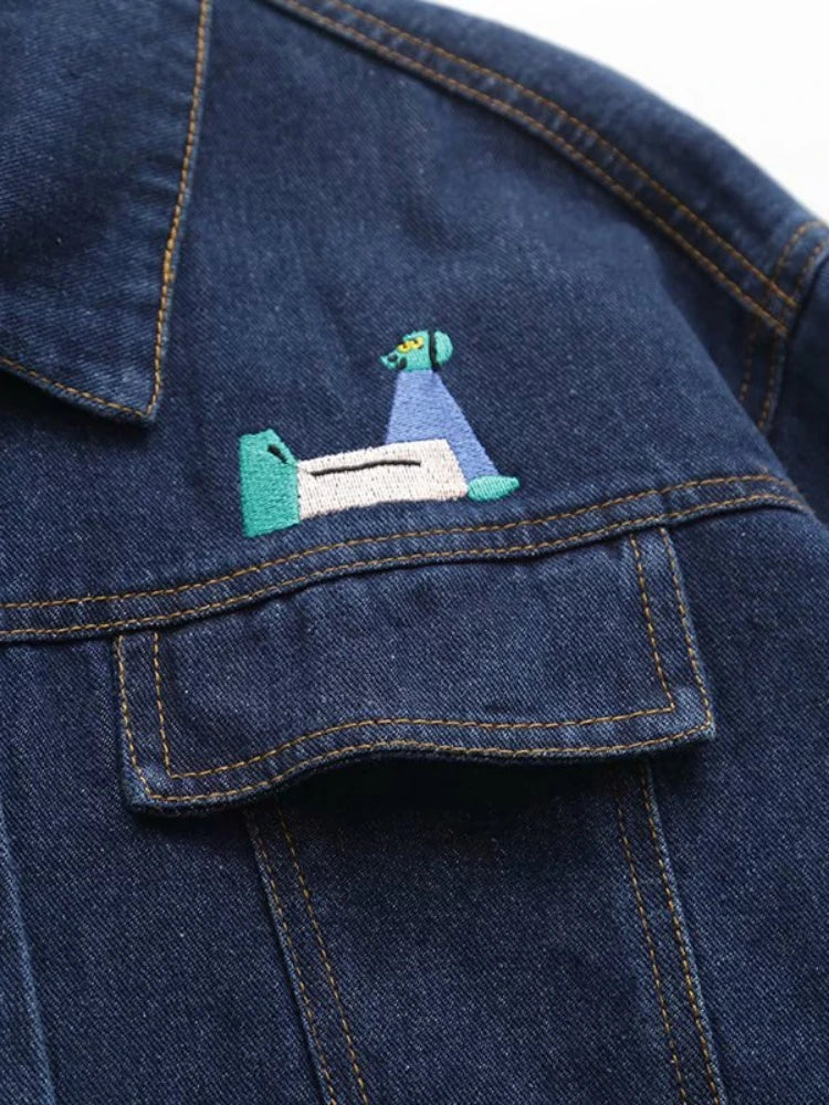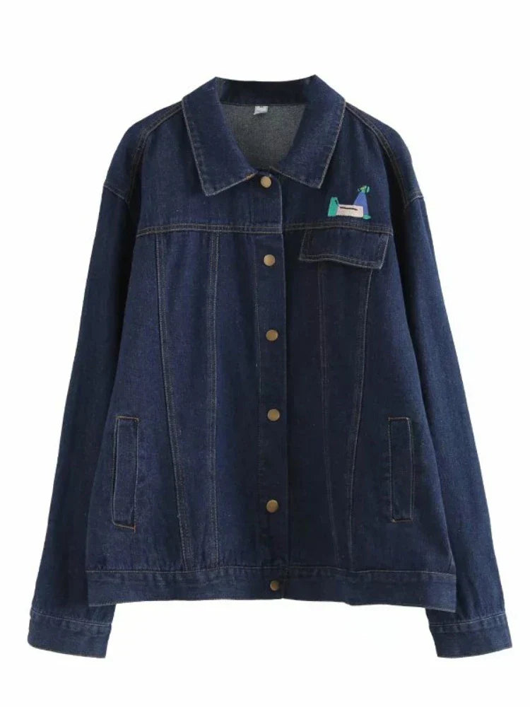 Blue Cartoon Embroidery Casual Women Denim Jackets AutumnVintage Long Sleeve Turndown Collar Ladies Outerwear Coat