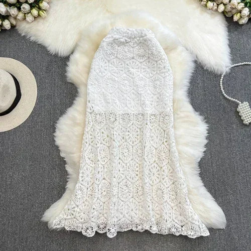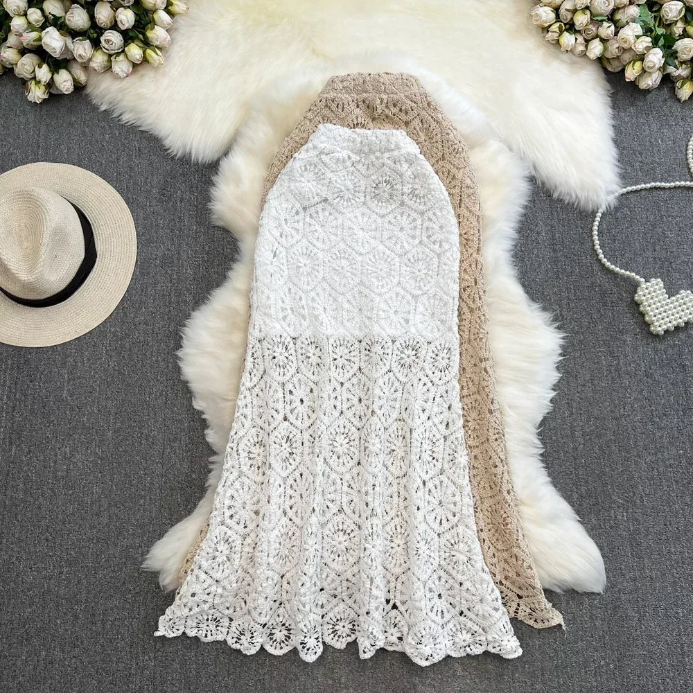maoxiangshop Boho Holiday Long Skirts Women Crochet Hollow Out Female Trumpet Skirt Ladies Elegant Lace Patchwork Summer Skirt