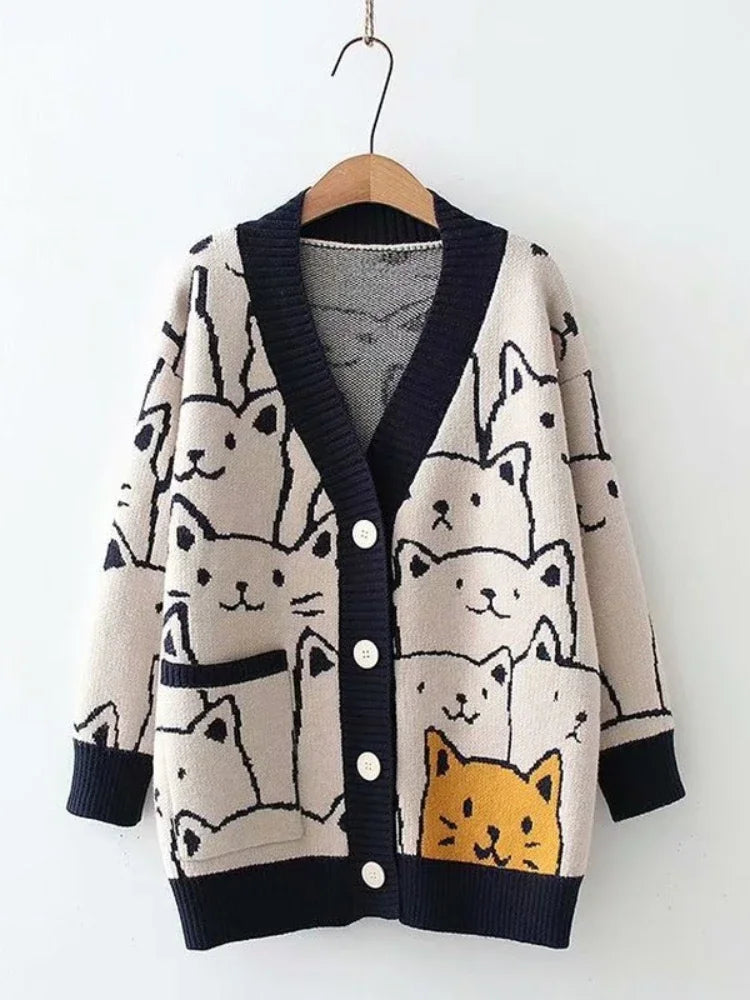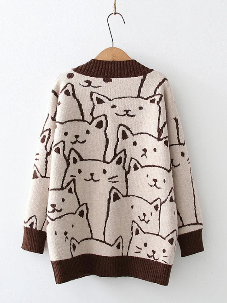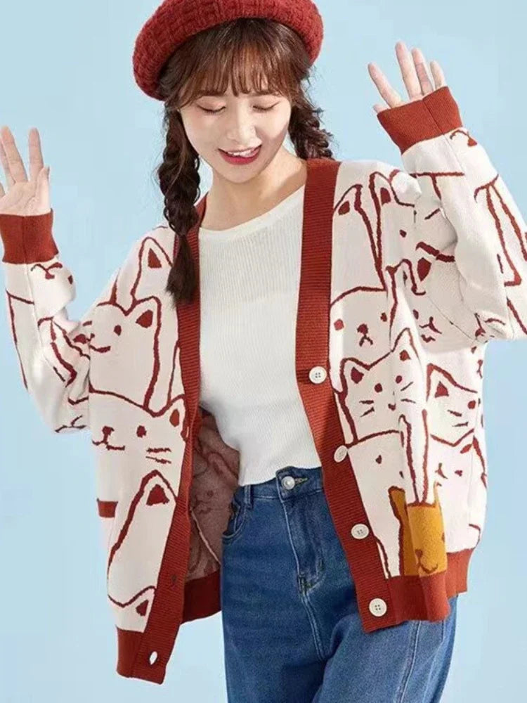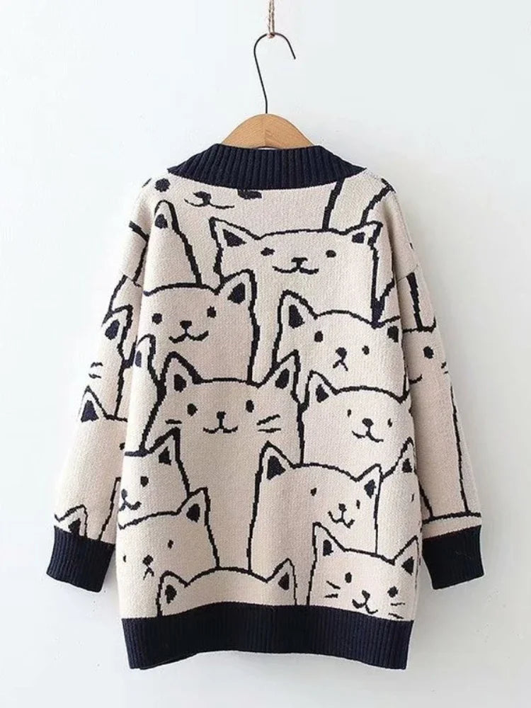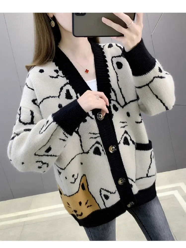 Cartoon Cat knitted cardigans Jumper Autumn Winter Womens Harajuku Sweater coat O-Neck Long Sleeve cardigan