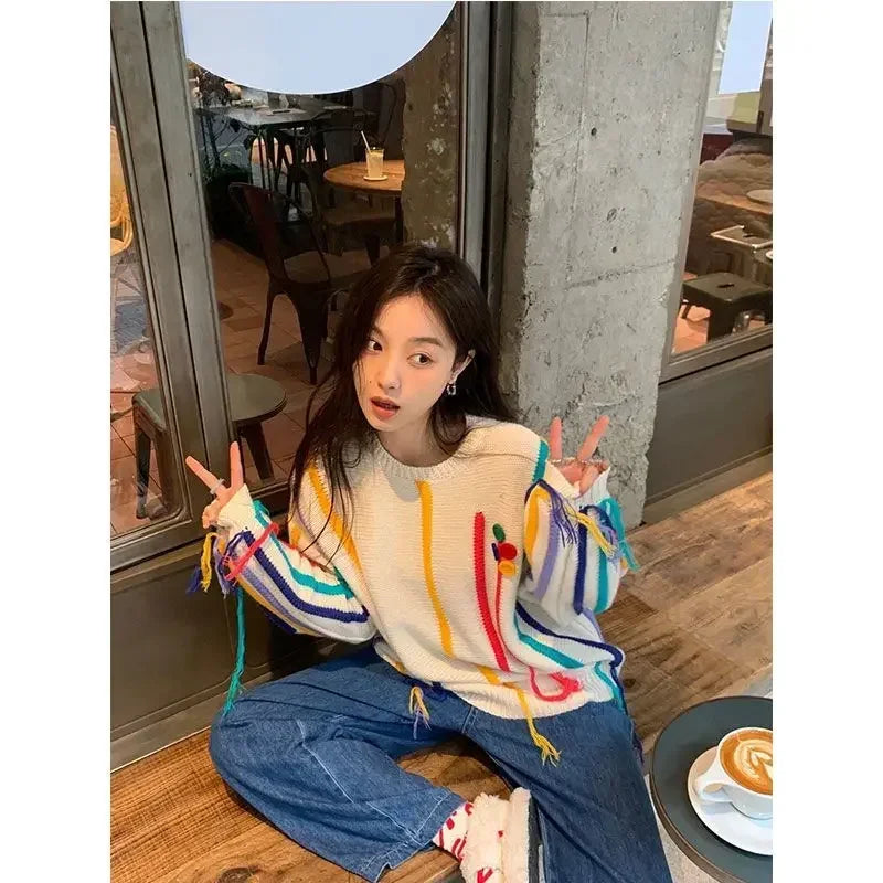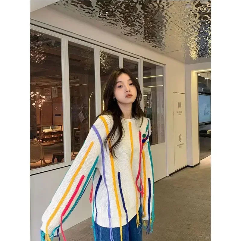 Colorful Striped Oversize Lazy and Trendy Sweaters for Women in Autumn and Winter Tassel Knit Design Loose Fitting Couple Top