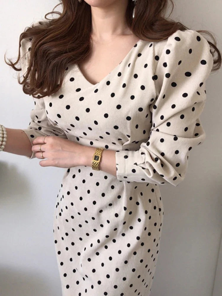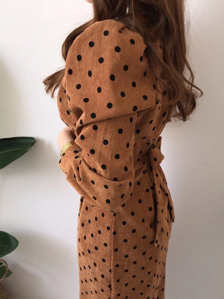 maoxiangshop Corduroy Women Autumn Mid-calf Dress Print Dot Tunic Bow Slim Pencil Dress Casual V Neck High Waist Elegant Party Vestidos