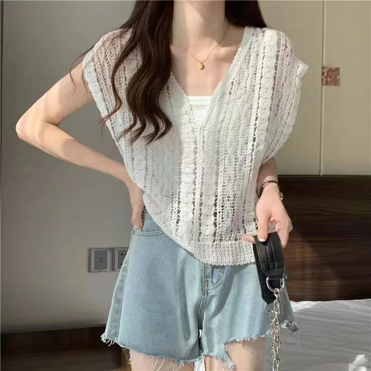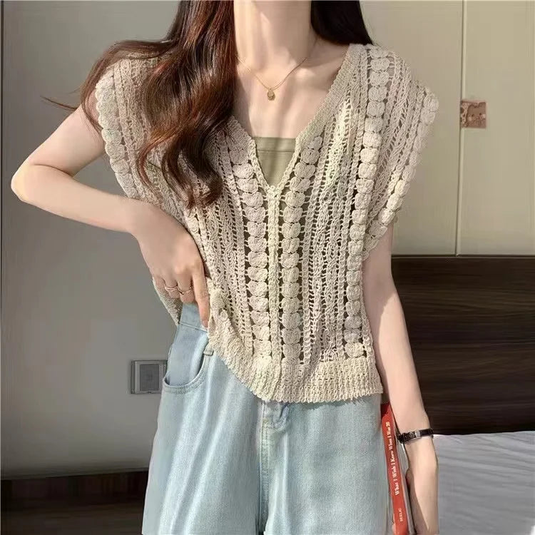 Cotton Crochet Tops Sexy Knitted Hollow Out Sleeveless T-Shirts Loose Female Women Clothing 2023 Summer New Vintage Tees Femme