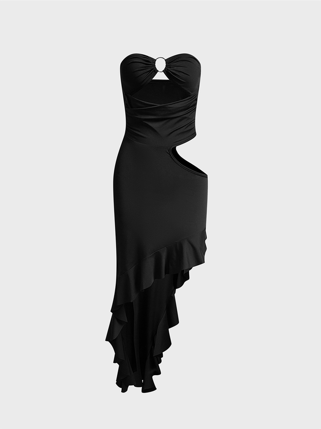 Cut Out Asymmetrical Design Ruffles Strapless Plain Sleeveless Maxi Dress