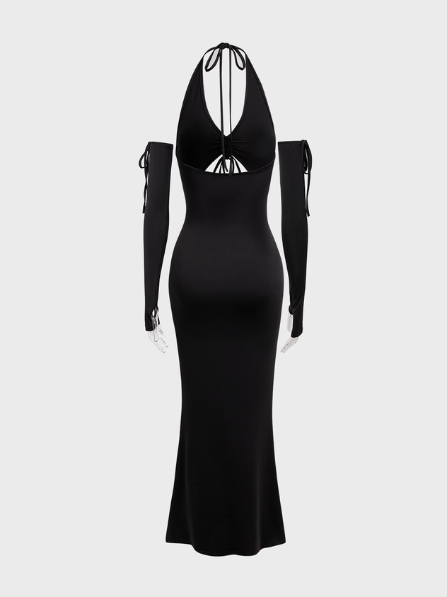 Cut Out Lace Up Halter Plain Long Sleeve Maxi Dress