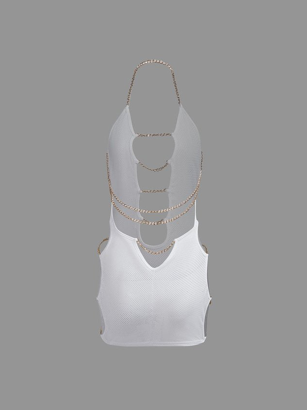 Cut Out Metal Chain Halter Plain Sleeveless Short Dress
