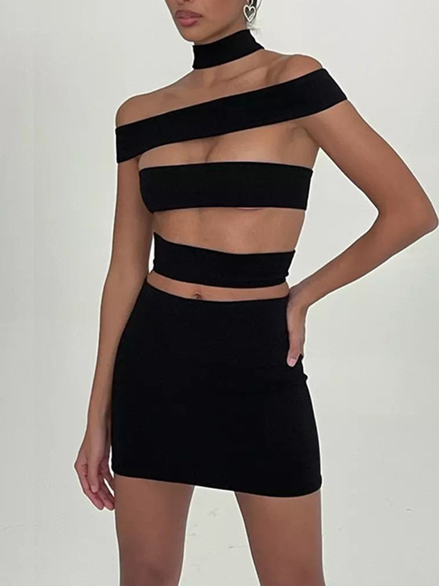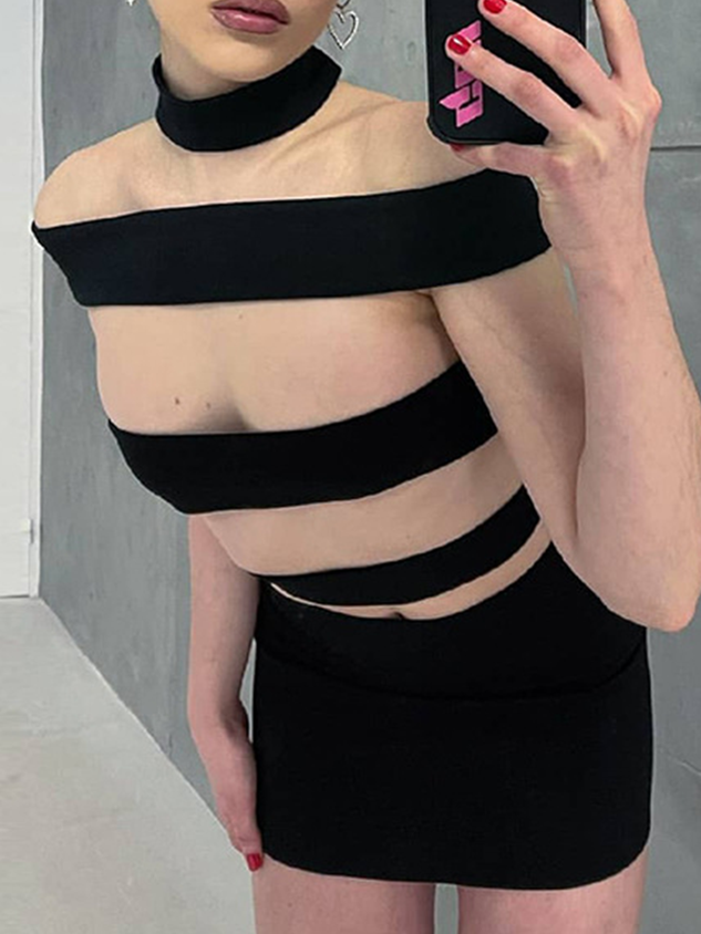 Cut Out Stand Collar Plain Sleeveless Short Dress