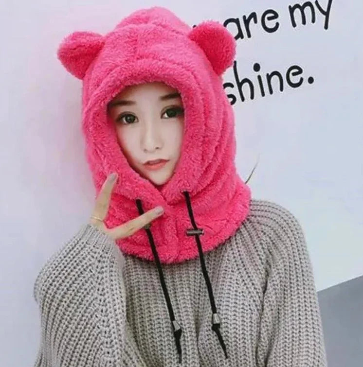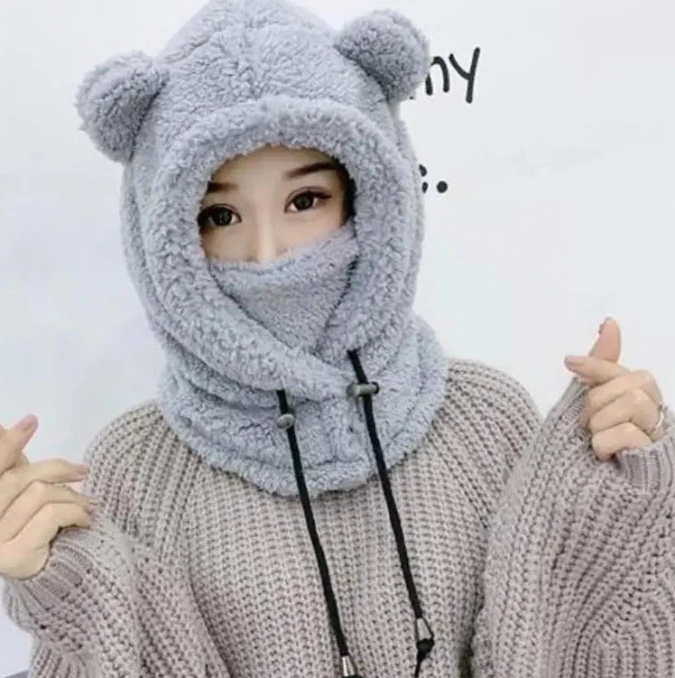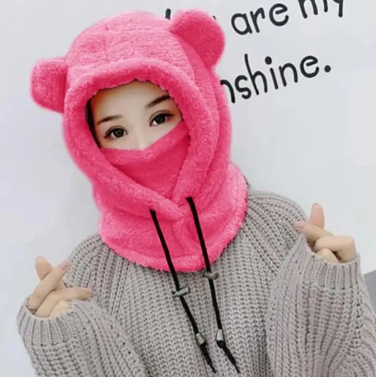 maoxiangshop Cute Winter Earflaps Plush Bear Ears Hats adult Warm Mask for Outdoor Women Bonnet Hood