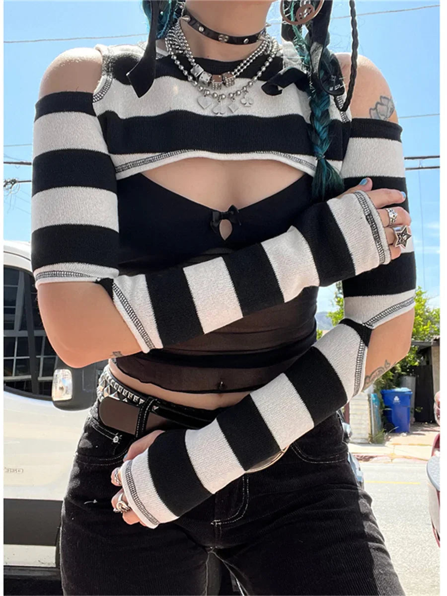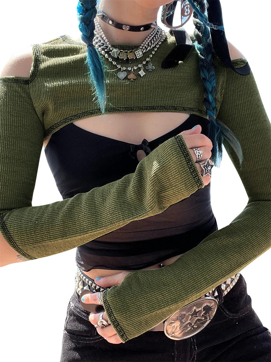Cutout Cold Shoulder Short T-Shirts Women Round Collar Long Sleeve Sun Protection Beach Cover-Up Streetwear Crop Tops