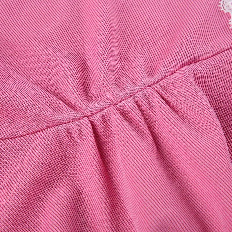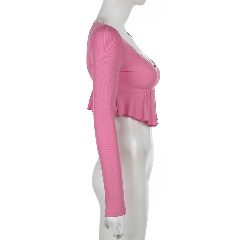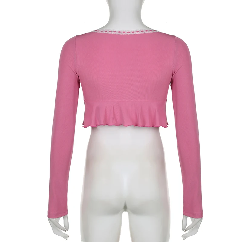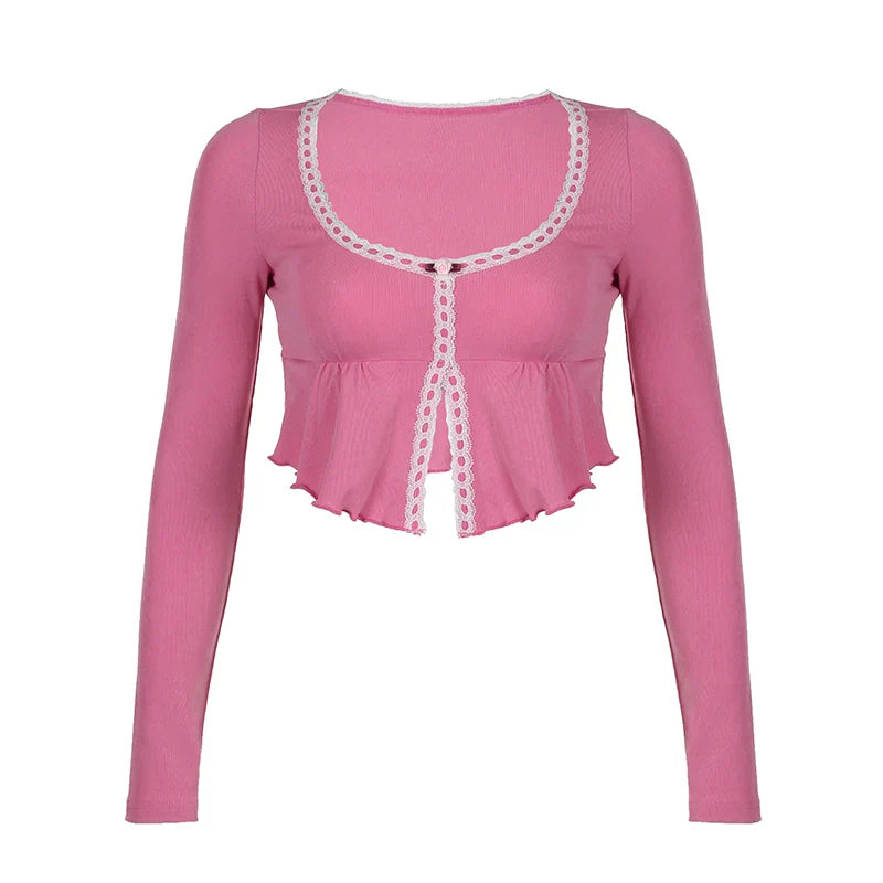Korean Fashion Pink Frill Crop Top Women T-shirts Slim Y2K Cute Lace Trim Coquette Clothes Fold Mini Tee Shirt Kawaii