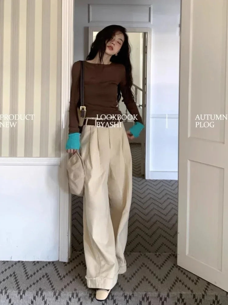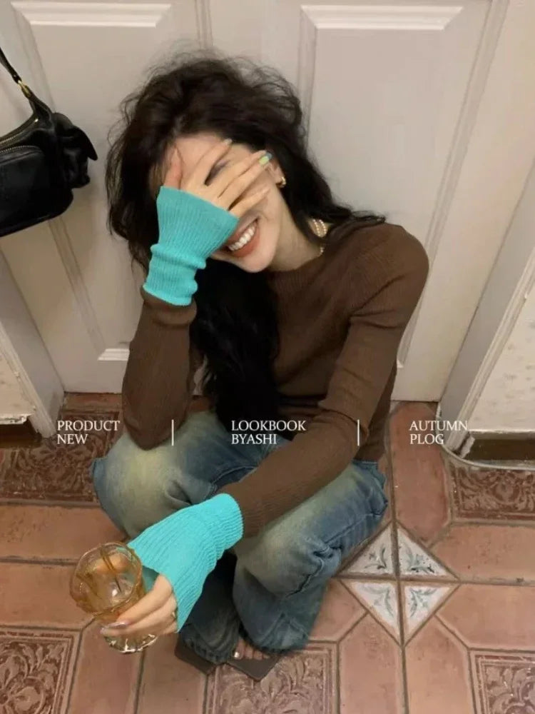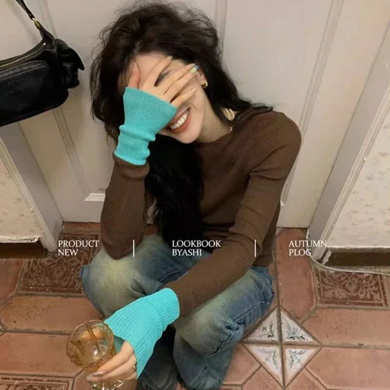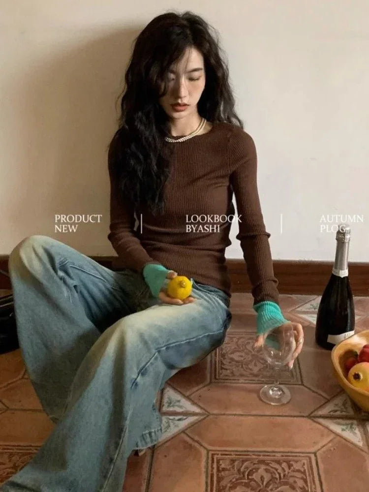 Deeptown 90s Vintage Ribbed Knitted Sweater Women Harajuku Slim Patchwork Jumper Korean Contrast Knitwear Y2K Tops Grunge Kpop