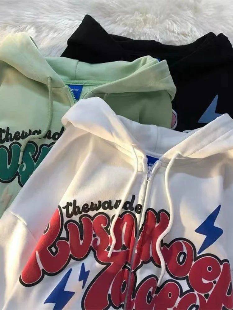 American Retro Zip Up Graphic Hoodies Women Streetwear Loose Letter Printed Hooded Sweatshirts Hiphop Thin Top
