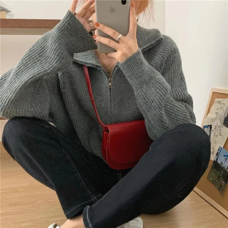 Deeptown Casual Knitted Cardigan Sweaters Women 2022 Autumn Vintage Zip-up Solid Loose Long Sleeve Tops Knitwear Chic Kpop