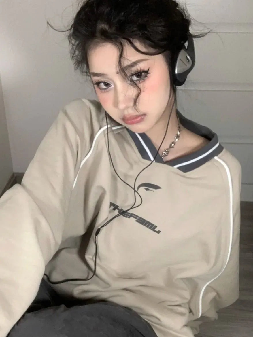 maoxiangshop1 Vintage V Neck Sweatshirt Women Korean Fashion Streetwear Kpop Pullover Casual Harajuku Grunge Cotton Top Autumn Winter