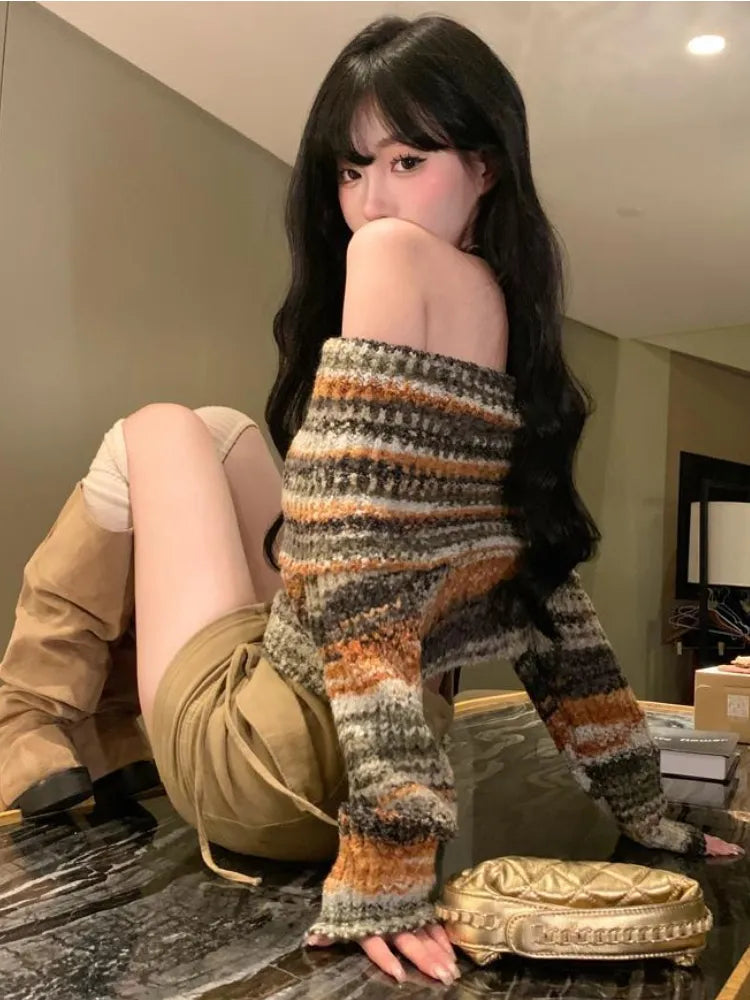 Deeptown Y2K Vintage Striped Cropped Sweater Women Harajuku Hip Hop Slim Knitted Jumper Sweet Off Shoulder Pullover Korean Tops