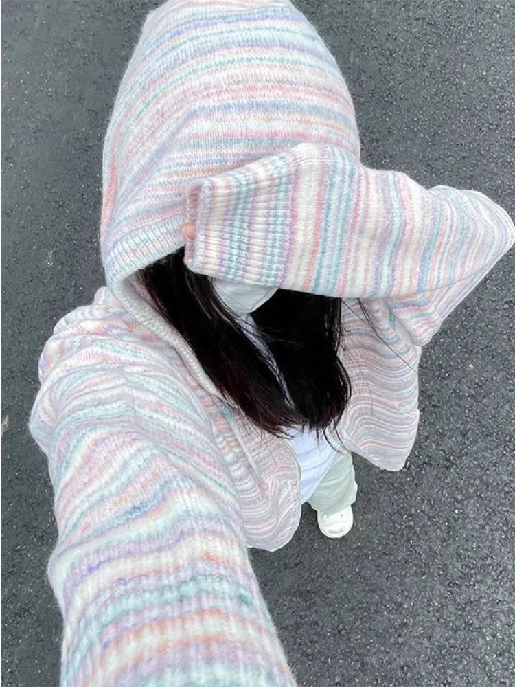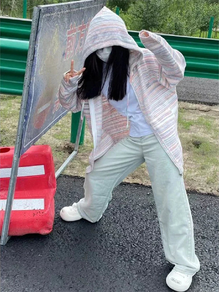 Deeptown Y2K Vintage Striped Knitted Cardigan Women Harajuku Hippie Zipper Oversized Sweater Casual Hooded Tops Coats Streetwear