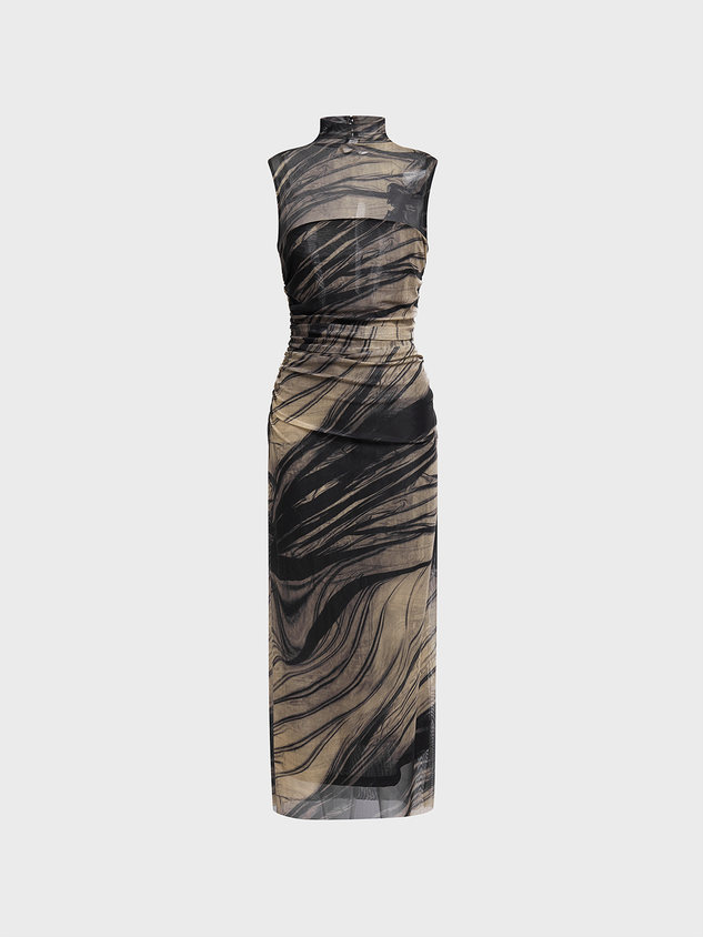Double Layer Wrinkled Half Turtleneck Abstract Sleeveless Maxi Dress