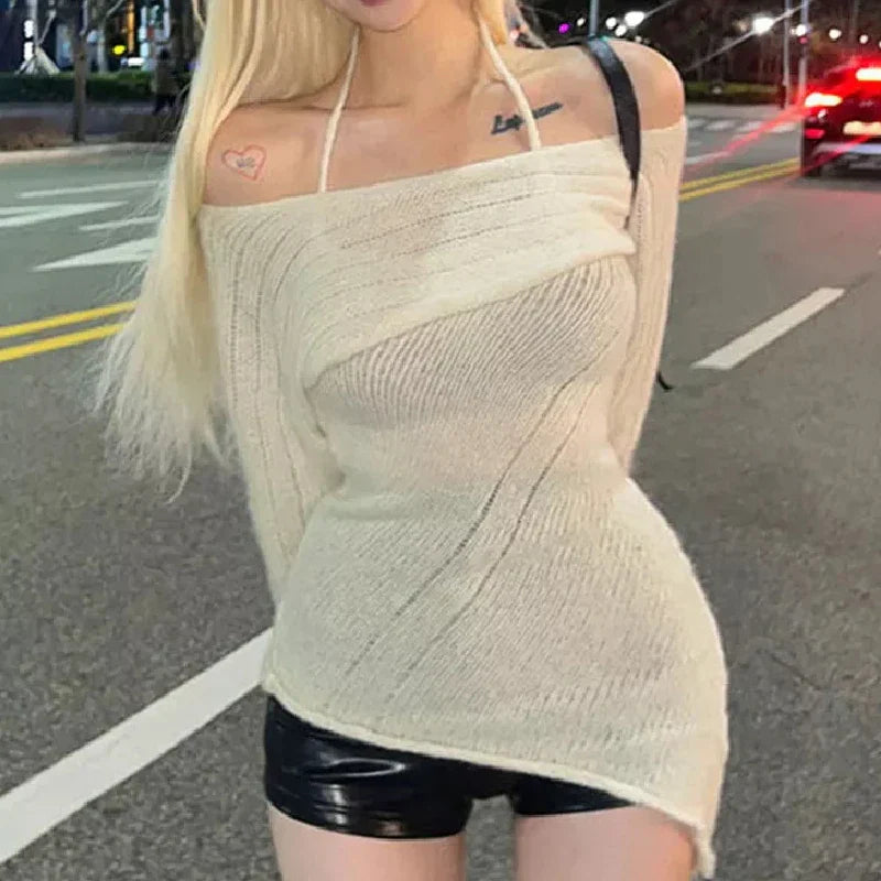 Dourbesty Harajuku Sweaters Y2k Asymmetrical Chic Korean Fashion Knitted Pullovers For Women Halter Camisole + Slash Neck Tops